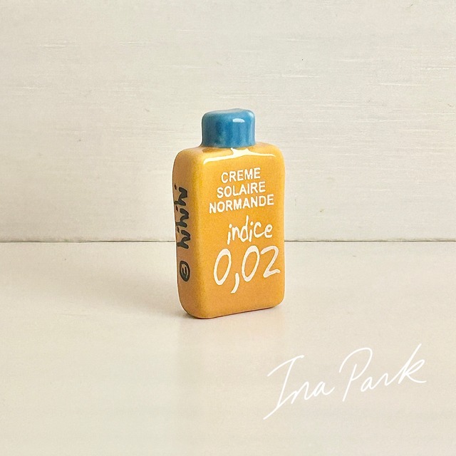 2019年/Heula Normandie Fort et Vert 全10種 雨にも負けず、緑豊かでたくましいノルマンディー!シリーズ/© hihihi ♦︎「Crème solaire normande(ノルマンディーの日焼け止め)/indice 0,02」 SPF0.02の日焼け止め。 普通、SPFは「50」など高いほど日差しが強い場所向け。 ノルマンディーは曇天ばかりで日差しが弱いから、 「0.02で十分」という自虐ジョーク。 そういえばフランスの多くの方は太陽を浴びに南へ旅行したりと日差しが大好きですよね。 地域をテーマにしたイラストが楽しいデザイン会社/アートチームのノルマンディーコレクションがフェーヴに。地域ジョークがユーモラスで洗練された小ネタになっています。 ノルマンディーは年間の降水日はおよそ180〜200日 つまり「1年のうち半分以上が雨か曇り」この天気のせいで、ノルマンディーでは 「傘を閉じるタイミングがない」 「バーベキューも雨の中でやる」 といった”雨ジョーク”が文化になっているそう。他のイメージとしては牛・リンゴ・牧草地など) ノルマンディー地方のデザインスタジオ「Le Trait d’Humour」(直訳:ユーモアの線)社のサイトでも素敵なイラストを見ることができます。 ブルターニュ、バスク地方、アルザス、パリなども展開されているようです。 色味やデザインなど、個人的にツボというかめちゃめちゃ可愛いと思うのですがいかがでしょうか。 コンディション:良 -----------フェーブについて------------ 海外製品+陶器という性質上、仕上がりに個体差があります。 色のかかっていない場所や気泡などが見られることもありますのでご了承下さいませ。
