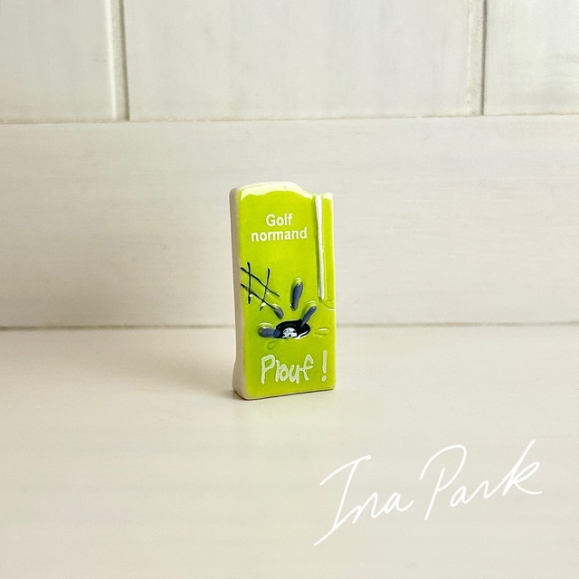 2019年/Heula Normandie Fort et Vert 全10種 雨にも負けず、緑豊かでたくましいノルマンディー!シリーズ/© hihihi ♦︎「Golf normand(ノルマンディーのゴルフ)」/「Plouf!(ドボン!)」 ゴルフボールが池に落ちた瞬間。 雨でぬかるんだり水たまりだらけのコースで 「ボールがいつも水に落ちる=Plouf!(ドボン!)」という笑い。 ノルマンディーの天気の悪さをおしゃれに風刺してます 地域をテーマにしたイラストが楽しいデザイン会社/アートチームのノルマンディーコレクションがフェーヴに。地域ジョークがユーモラスで洗練された小ネタになっています。 ノルマンディーは年間の降水日はおよそ180〜200日 つまり「1年のうち半分以上が雨か曇り」この天気のせいで、ノルマンディーでは 「傘を閉じるタイミングがない」 「バーベキューも雨の中でやる」 といった”雨ジョーク”が文化になっているそう。他のイメージとしては牛・リンゴ・牧草地など) ノルマンディー地方のデザインスタジオ「Le Trait d’Humour」(直訳:ユーモアの線)社のサイトでも素敵なイラストを見ることができます。 ブルターニュ、バスク地方、アルザス、パリなども展開されているようです。 色味やデザインなど、個人的にツボというかめちゃめちゃ可愛いと思うのですがいかがでしょうか。 コンディション:良 -----------フェーブについて------------ 海外製品+陶器という性質上、仕上がりに個体差があります。 色のかかっていない場所や気泡などが見られることもありますのでご了承下さいませ。