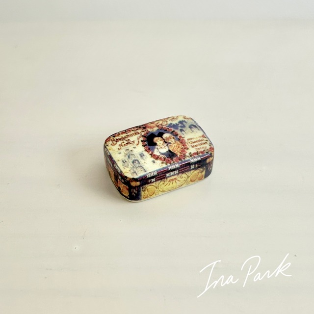 製造年不明 ヴィンテージ缶のシリーズ ♦︎Bergamotes de Nancy(ベルガモット・ド・ナンシー)のキャンディ缶 フランス・ロレーヌ地方ナンシーの名物キャンディ。 一人の女の子はアルザス地方の伝統衣装を着ているように見えますので、地理的に近いことが関係しているのかもしれません。 (※独自調べですので参考程度にご覧ください) なかなか出会えないヴィンテージ缶シリーズ。 このようなフェーブが多く作られていた2000年のシリーズかもしれません。 19〜20世紀初頭のフランス広告を思わせる、Belle Époque(美しい時代)なテイスト。 ビスケット缶・ショコラ缶・薬箱など、当時存在した商品缶をイメージしていると思われます。 コンディション : 目立つ傷汚れ無し ※こちらはフランスのコレクターの方の持ち物でした。 大切に保管されていたもので全体的に状態は良いですが、スレや古傷などが見られる場合があります。