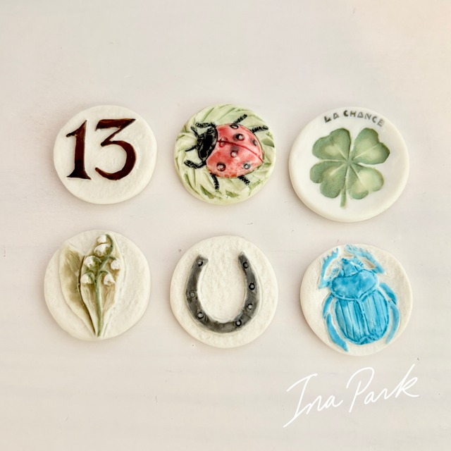 【ご希望の商品を選択して下さい】 2001 Porte-bonheur 幸運のお守りシリーズ 「Porte-bonheur(幸運のお守り)」は、ヨーロッパで古くから幸運の象徴とされてきたモチーフ。過度にポップにならない抑制された彩色に品格が漂います。 1.13(数字の13) 不運を跳ね返す力を持つとされる数字。逆に幸運を呼び込むラッキーナンバーとして扱われてきました。 2.てんとう虫(Coccinelle) 幸福の前触れを象徴する存在。願いを運ぶ縁起の良い昆虫として親しまれています。 3.四つ葉のクローバー(La chance) 偶然見つかることから、思いがけない幸運を象徴する植物です。 4.スズラン(Muguet) 幸福の訪れを意味する花。フランスでは5月1日に贈られる習慣があります。 5.馬蹄(Fer à cheval) 厄除けと幸運を招く守護の象徴。家の入口などに飾られてきました。 6.甲虫(スカラベ風モチーフ) 再生や守護、生命力を象徴する存在。お守りとしての意味合いが強いモチーフです。 ✴︎Midgard ミッドガール ノルマンディ地方・サント・アドレス ミッドガールは歴史のある工房で、父親のジャン・ピエール氏が亡くなった後 息子のムッシュー・デブリスさんが デザイン・型作り・調整・絵付けまで すべて手作業で行っておられます 。 高温で焼成される磁器製で、硬質なのに柔らかい白い色。 マットな作風なのにすべすべとした感触、というような、一目でミッドガールと分かる唯一無二の魅力と質感を持っています。 技術とアート性が高いフェーブ達は、本物のアーティスト作品です。 ♦︎コンディション:目立つ傷汚れなし