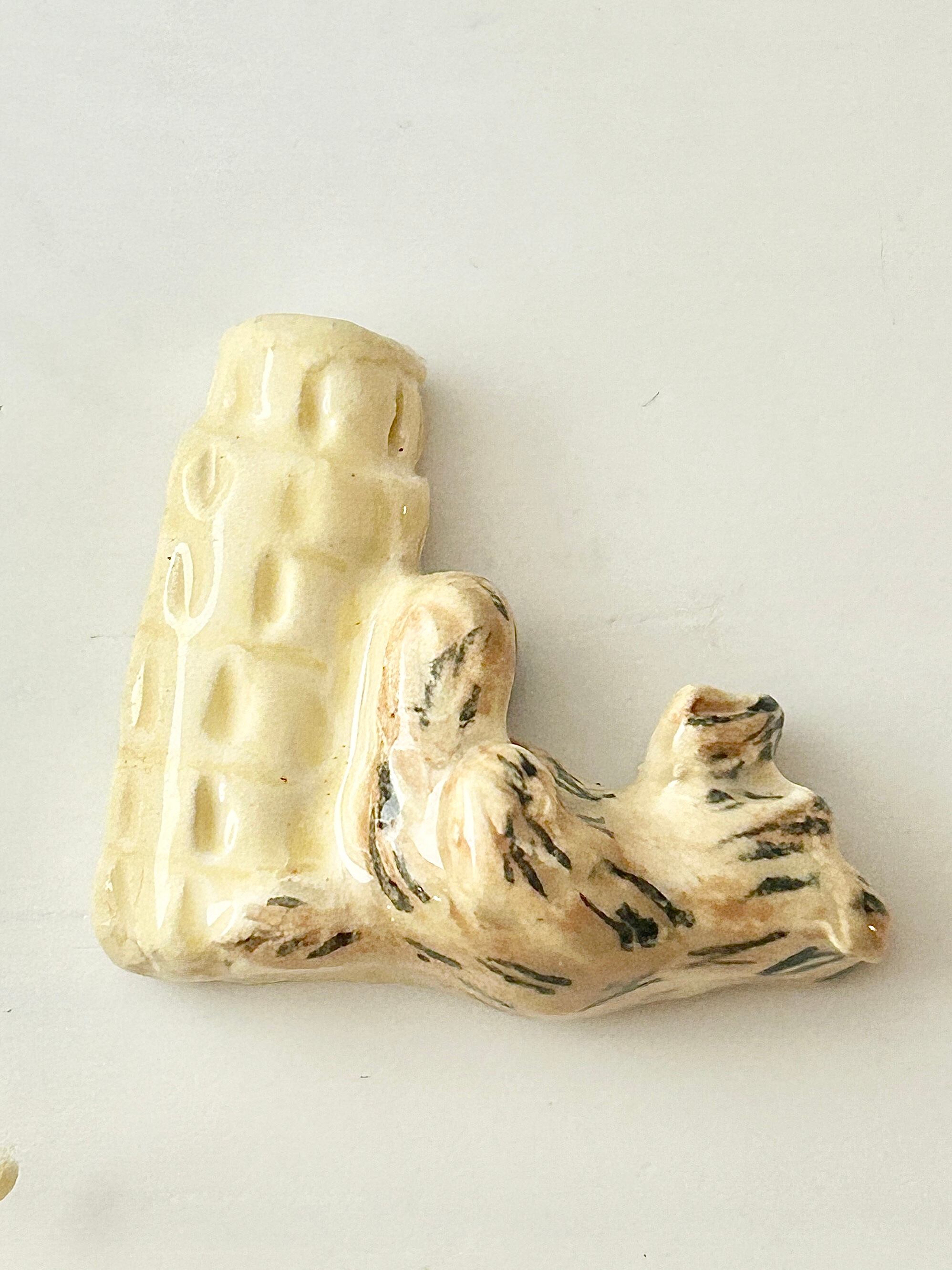 ピサの斜塔を足で支えているポーズがユーモラス。