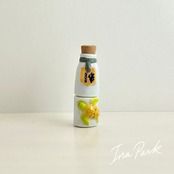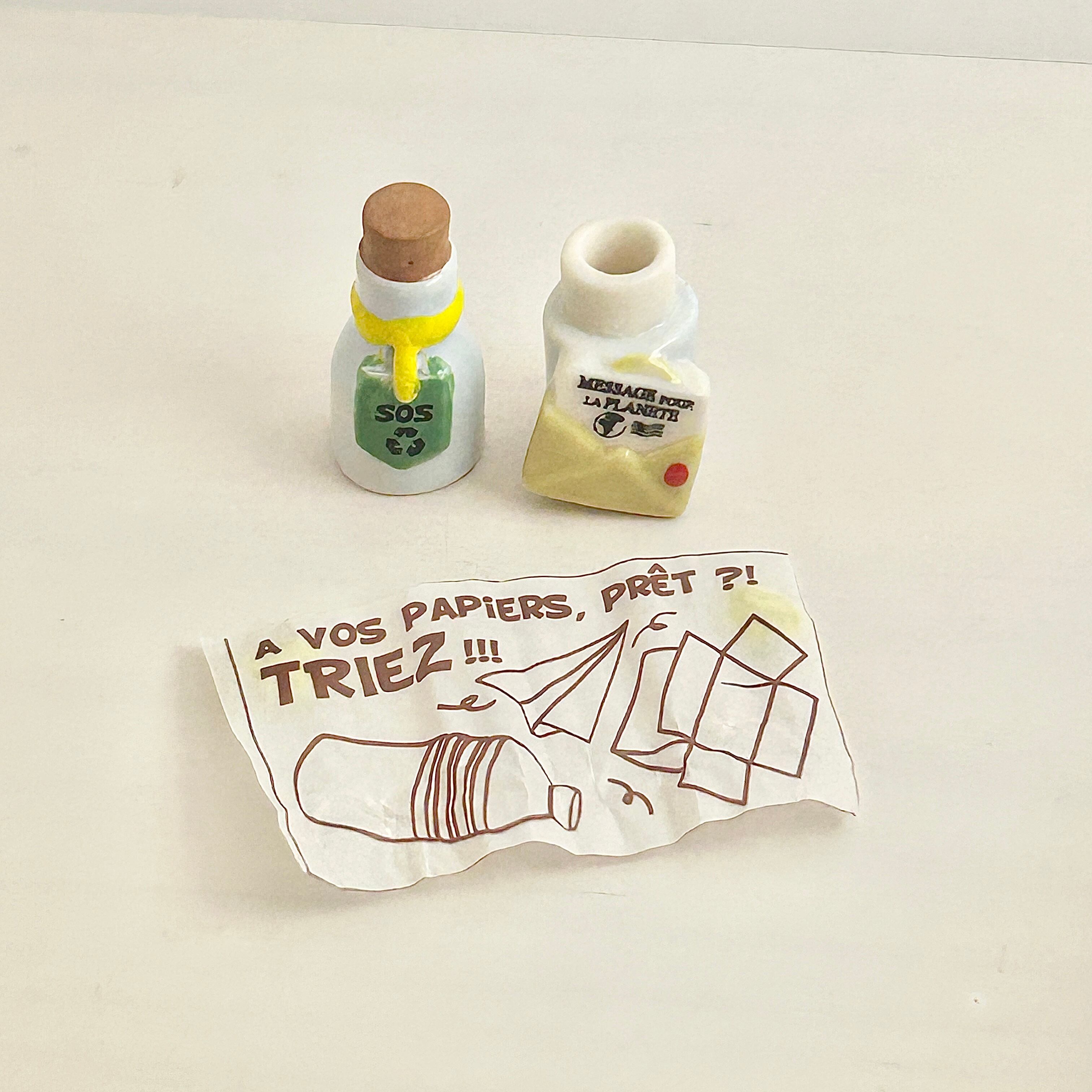 栓付きの小瓶のかたちに、数の少ない動物や自然、電気や水といったのモチーフが立体的にあしらわれています。開けることができ、中に入っている紙にはボトルのモチーフと連動したリサイクルや自然保護に関するメッセージが描かれています。