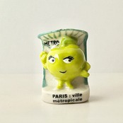 青リンゴのようなキャラクターが、パリの地下鉄の前に立つデザイン。