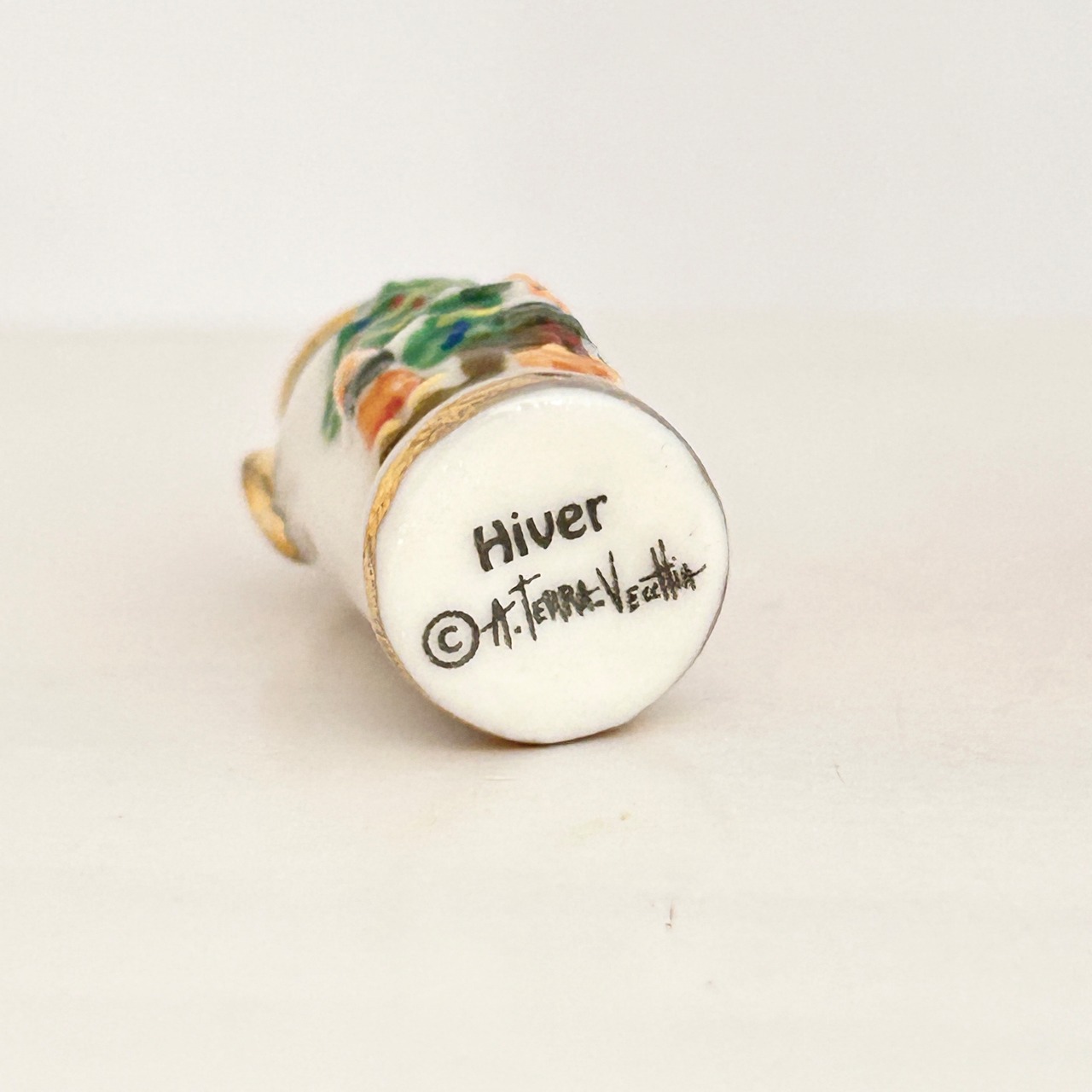 フランスの人気イラストレーター、アニック・テラ・ヴェッキア(Annick Terra Vecchia)のデザインが装飾に使われたミルク缶やバケツのフェーブです。テーマは「酪農を行う牧歌的な農村の一年」といったところだと思われます。立体感と金彩でとても豪華。底には季節の表記あり。