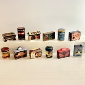 ビスケット缶・ショコラ缶・薬箱など、当時存在した商品缶をイメージしていると思われます。