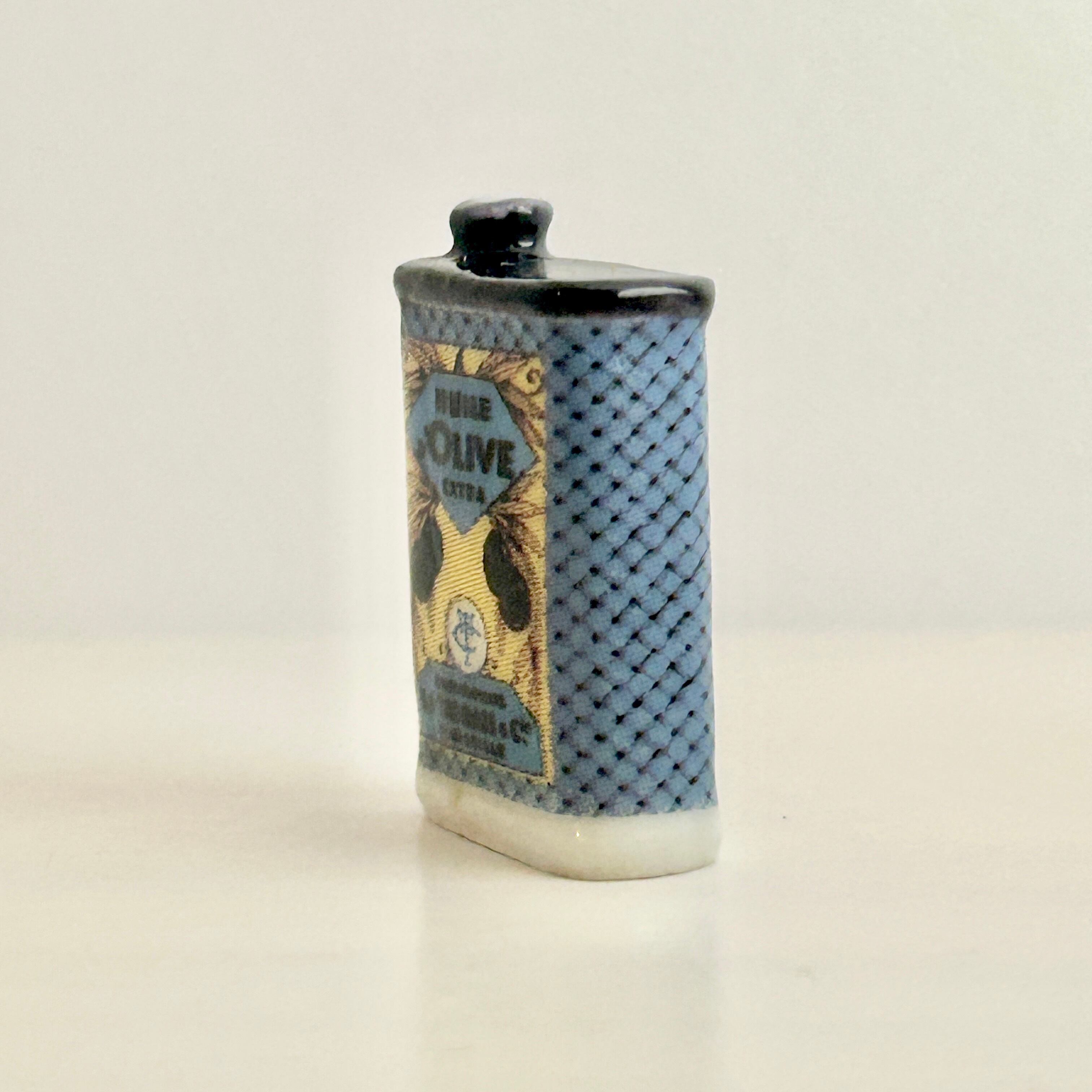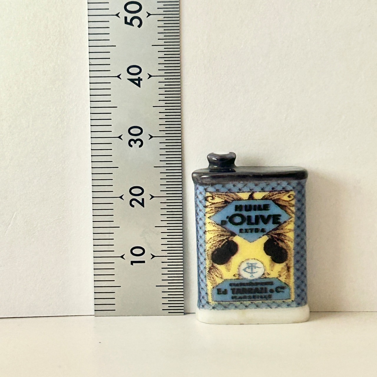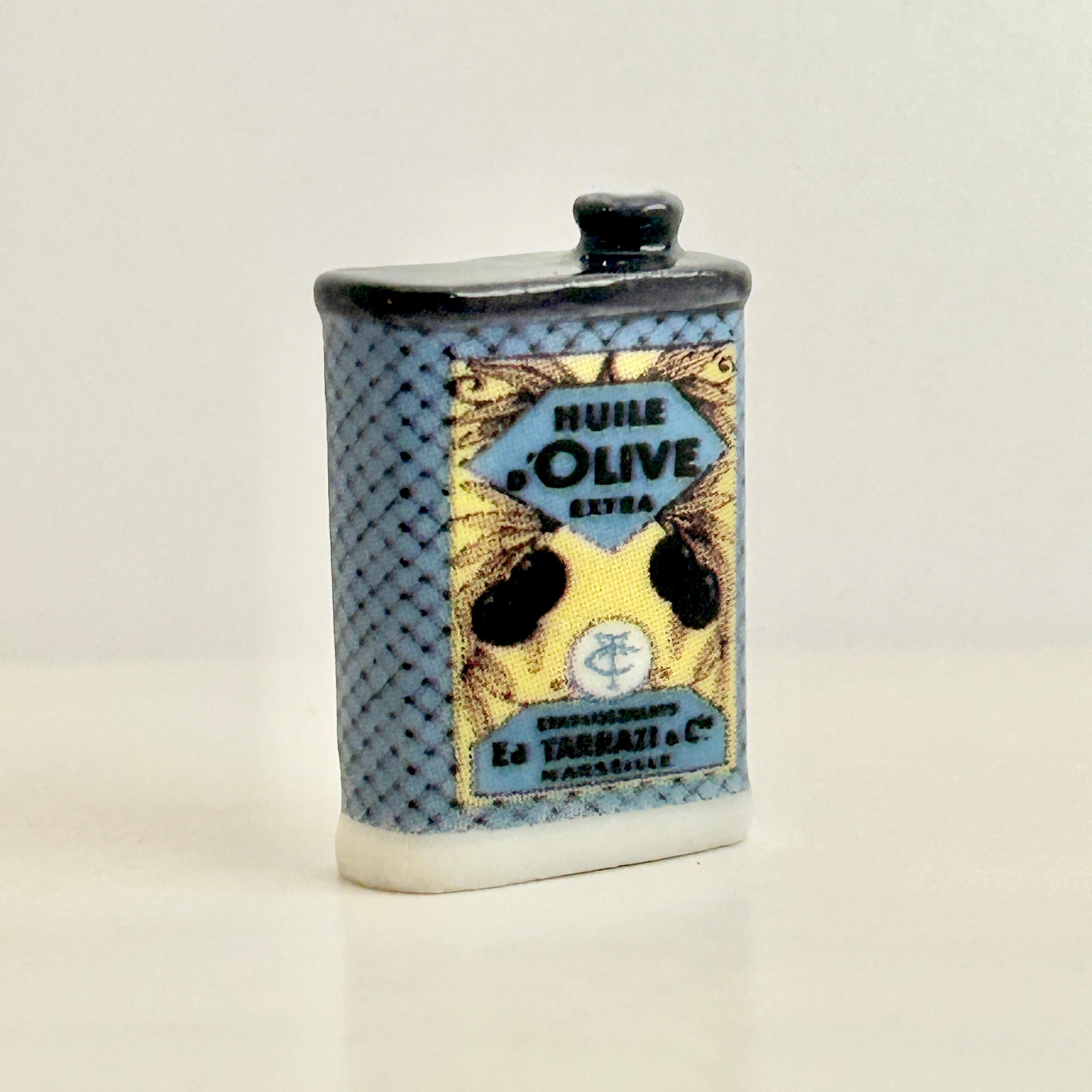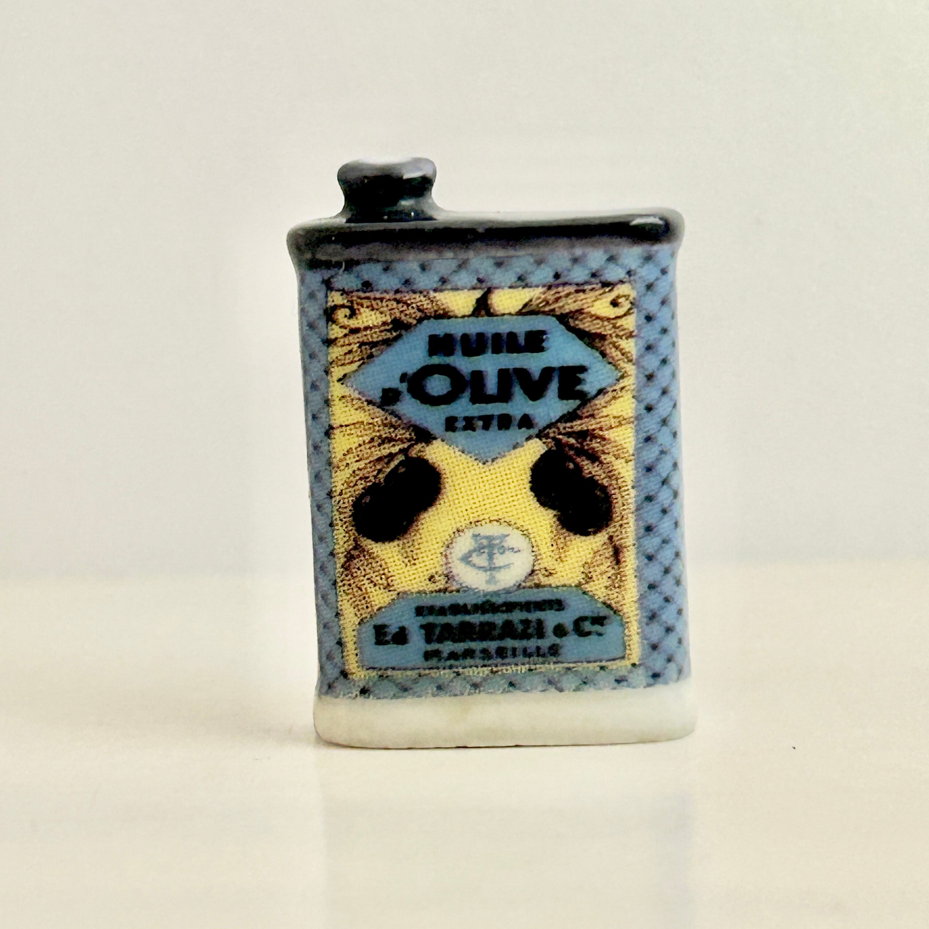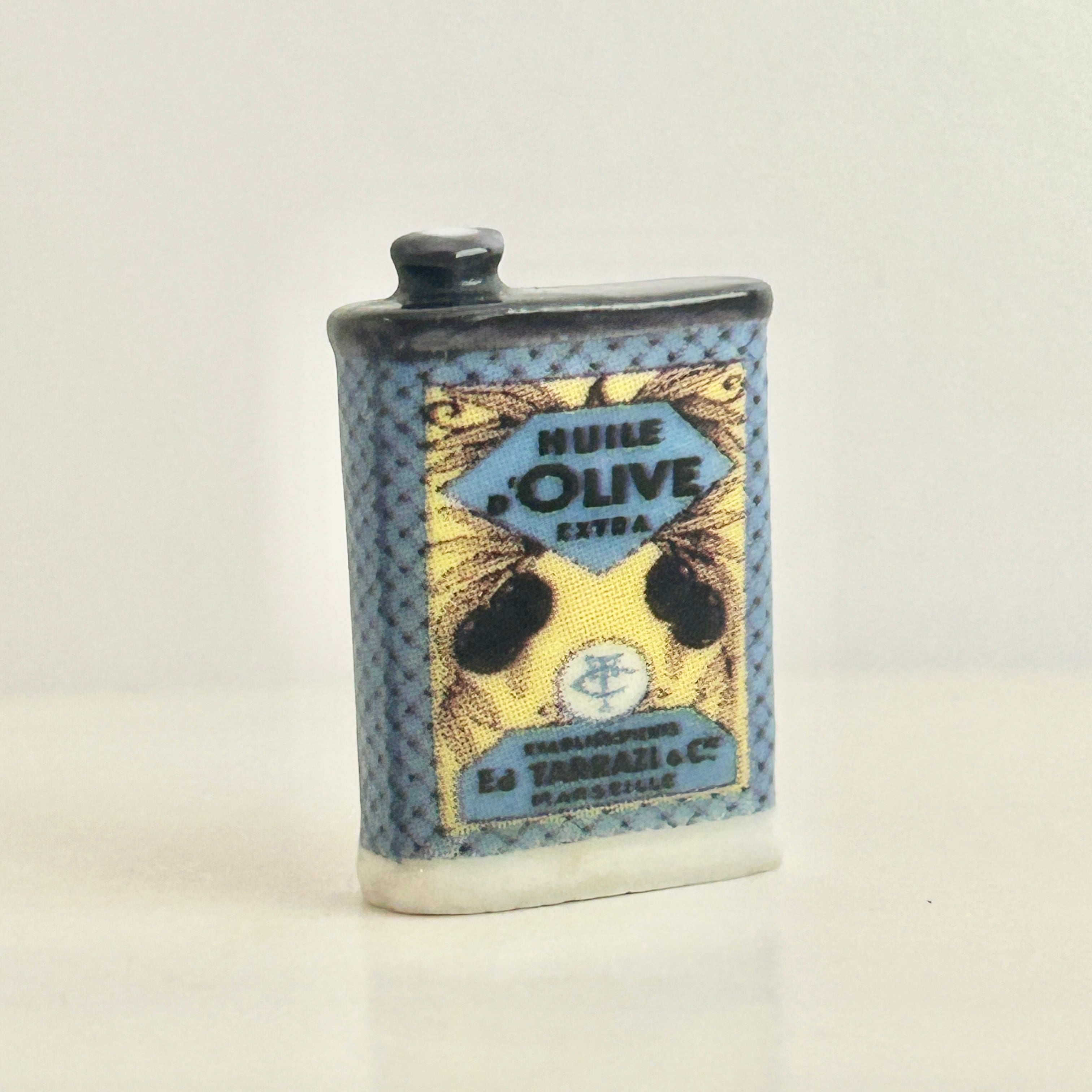 マルセイユの老舗オリーブオイル商 “E. Tarazzi & Cie” の古い商業広告デザインのオイル缶。
