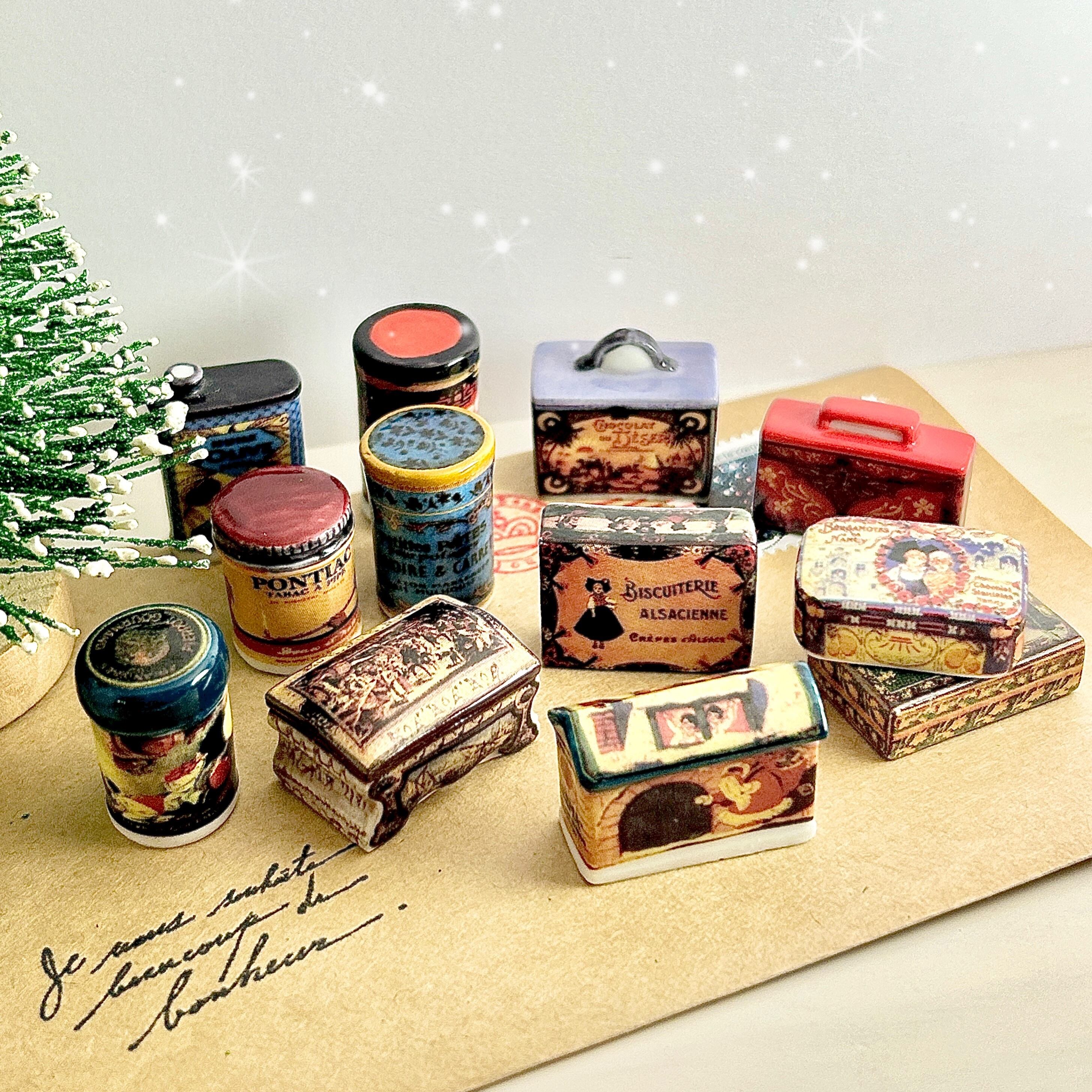 ビスケット缶・ショコラ缶・薬箱など、当時存在した商品缶をイメージしていると思われます。