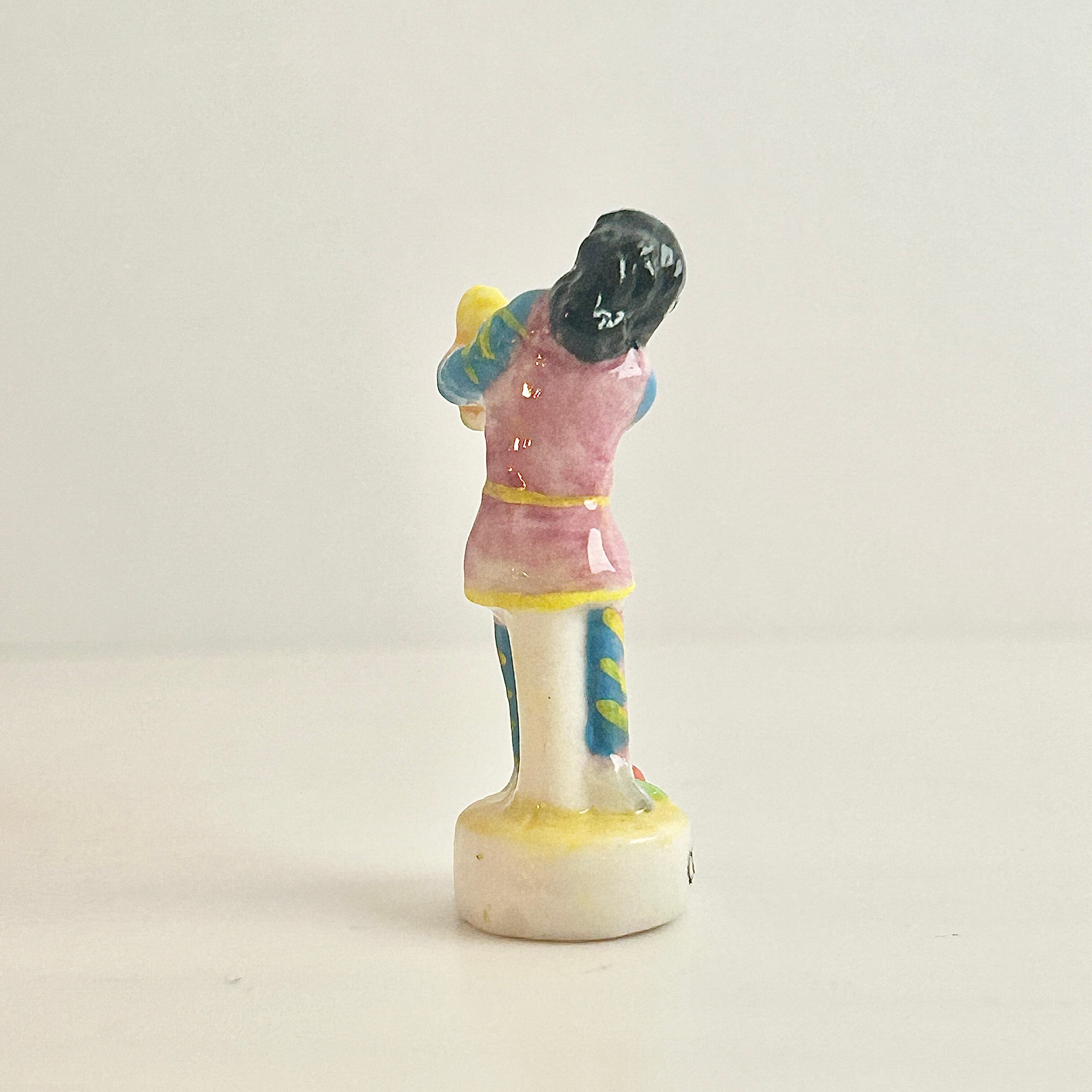 製造年不明ですが台座フォントや顔の特徴などから、おそらくヴィンテージ〜2000年前後の比較的古いフェーヴと思われます。真っ白なポーセリン製で、黒い背景では夜空に浮いているように綺麗です。アルルカンやコロンビーヌの服の色もセンスよく、細かな手彩色。