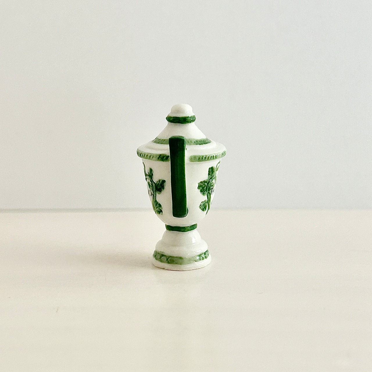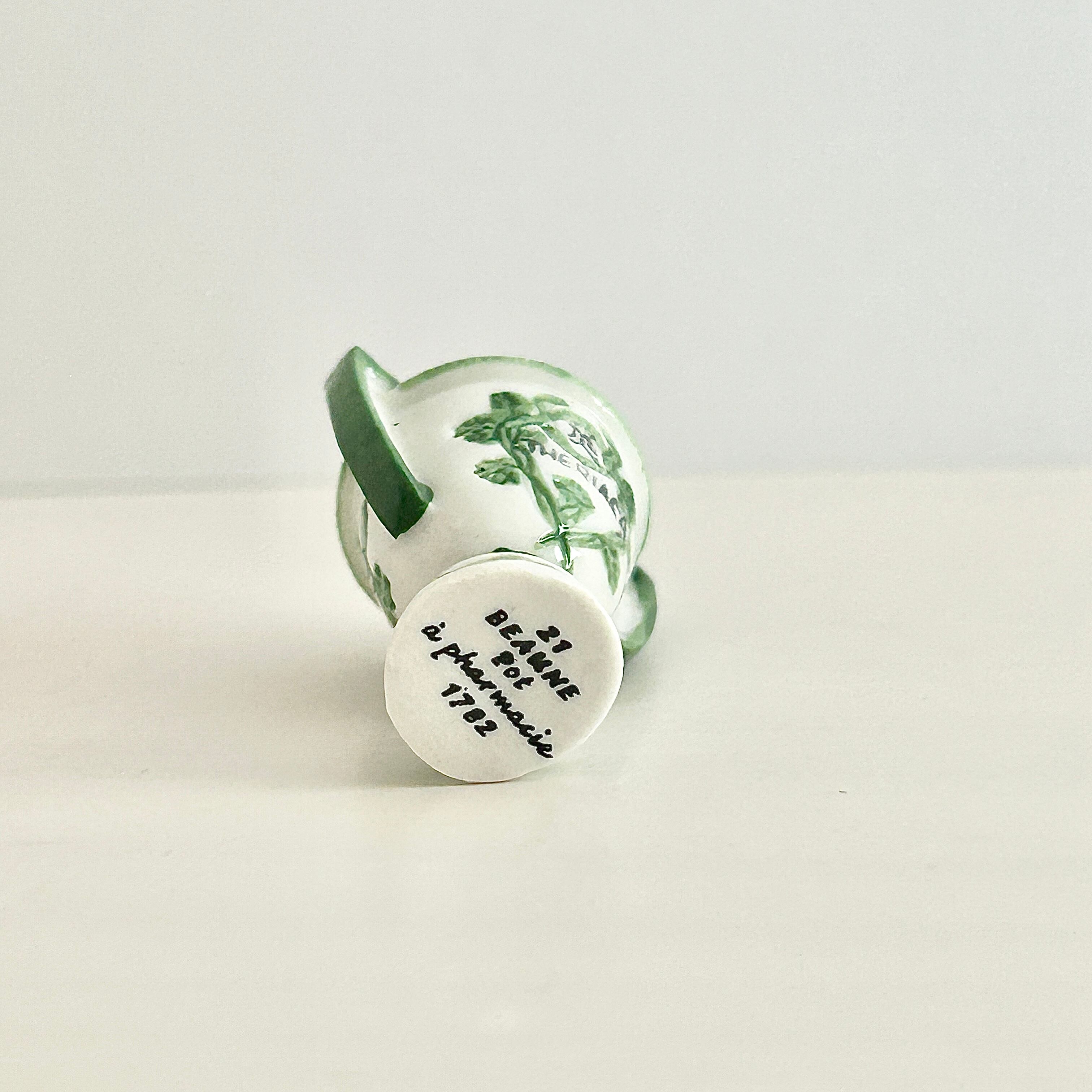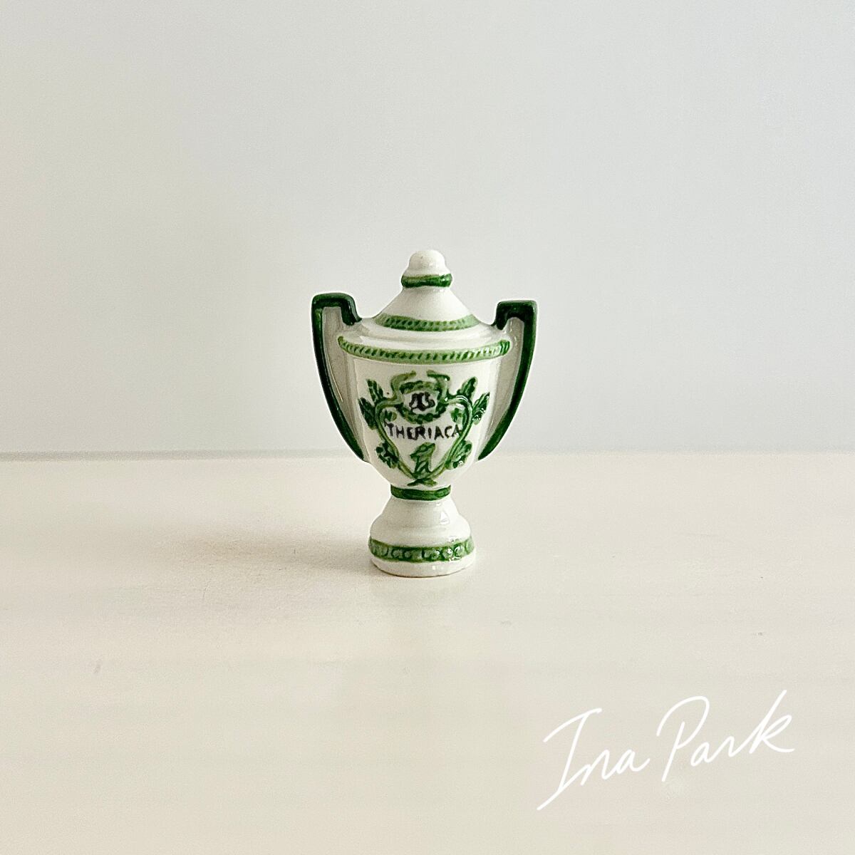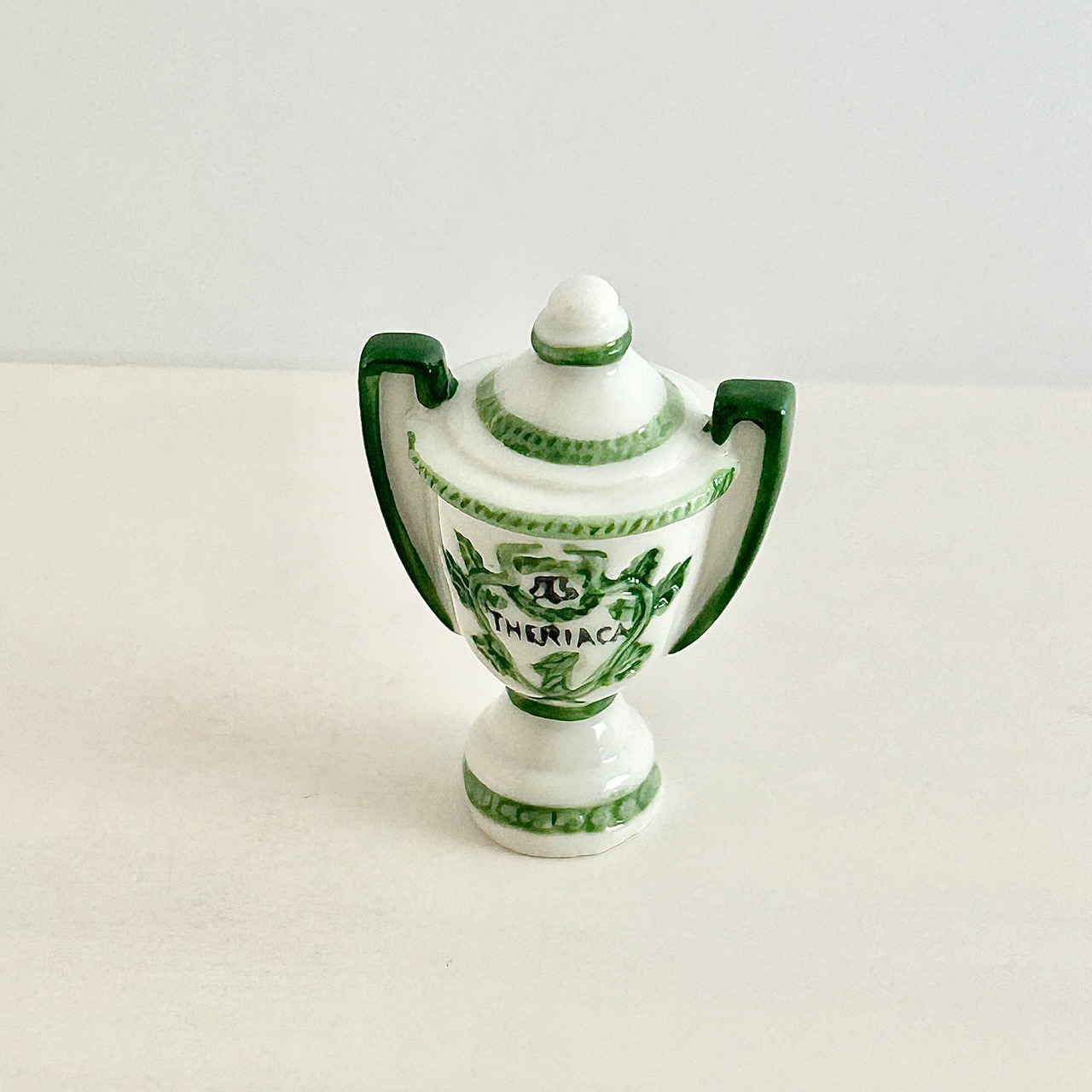 壺の文字THERIACA(テリアカ)は古代〜中世の薬剤 “テリアック(Theriac)” のラテン語表記。テリアックは、毒の解毒剤、万能薬としての丸薬、強壮剤としてヨーロッパ中で使われていた有名な薬です。1782年頃の薬局壺がモデル。白地に紋章が描かれることが多い、典型的な薬局壺。