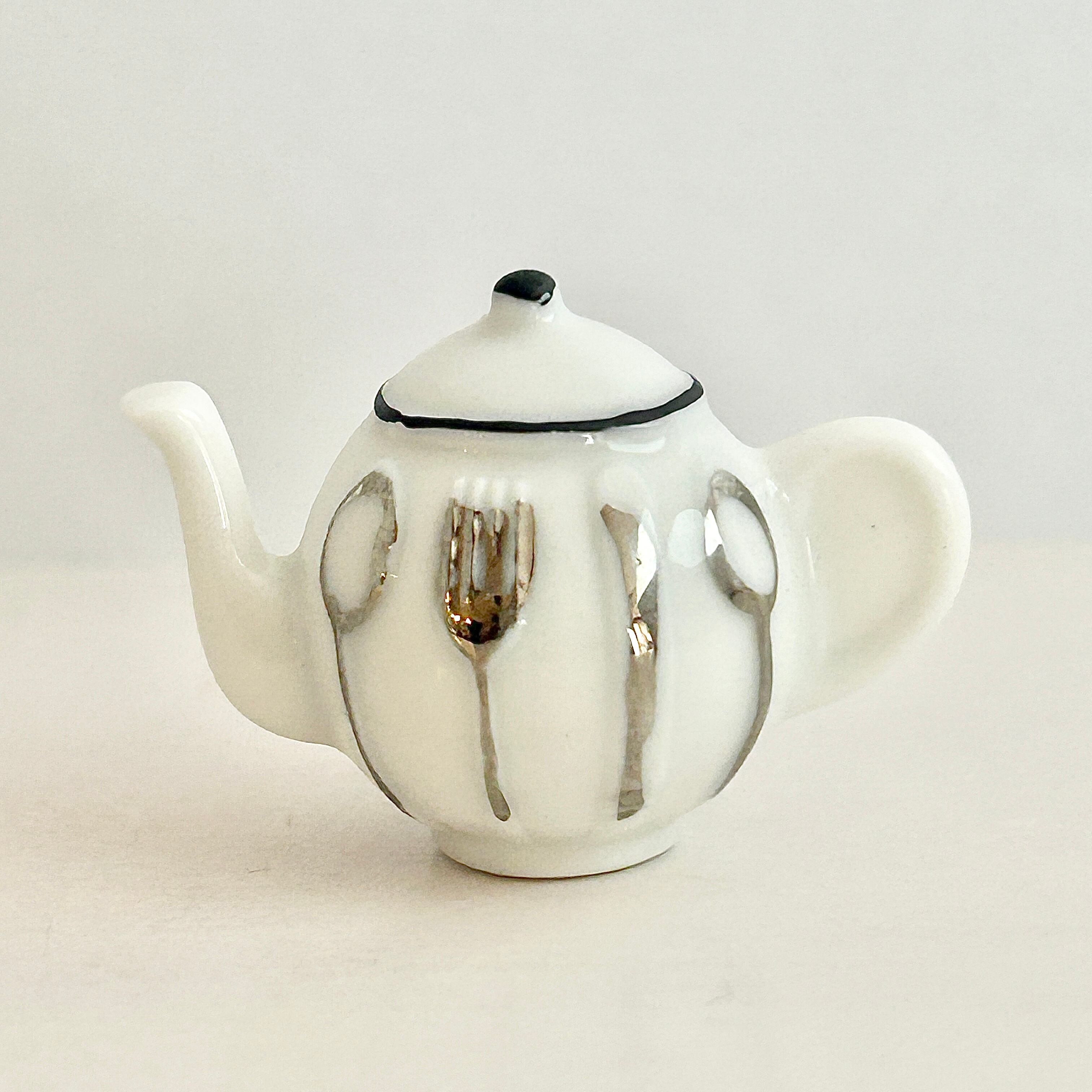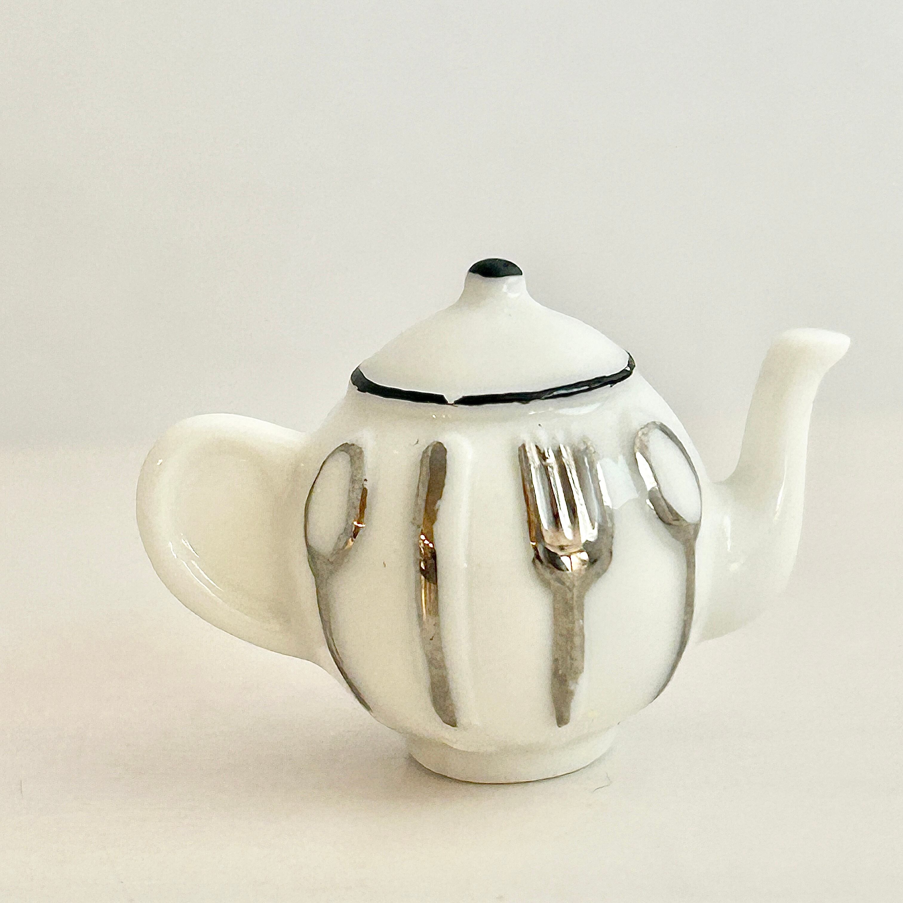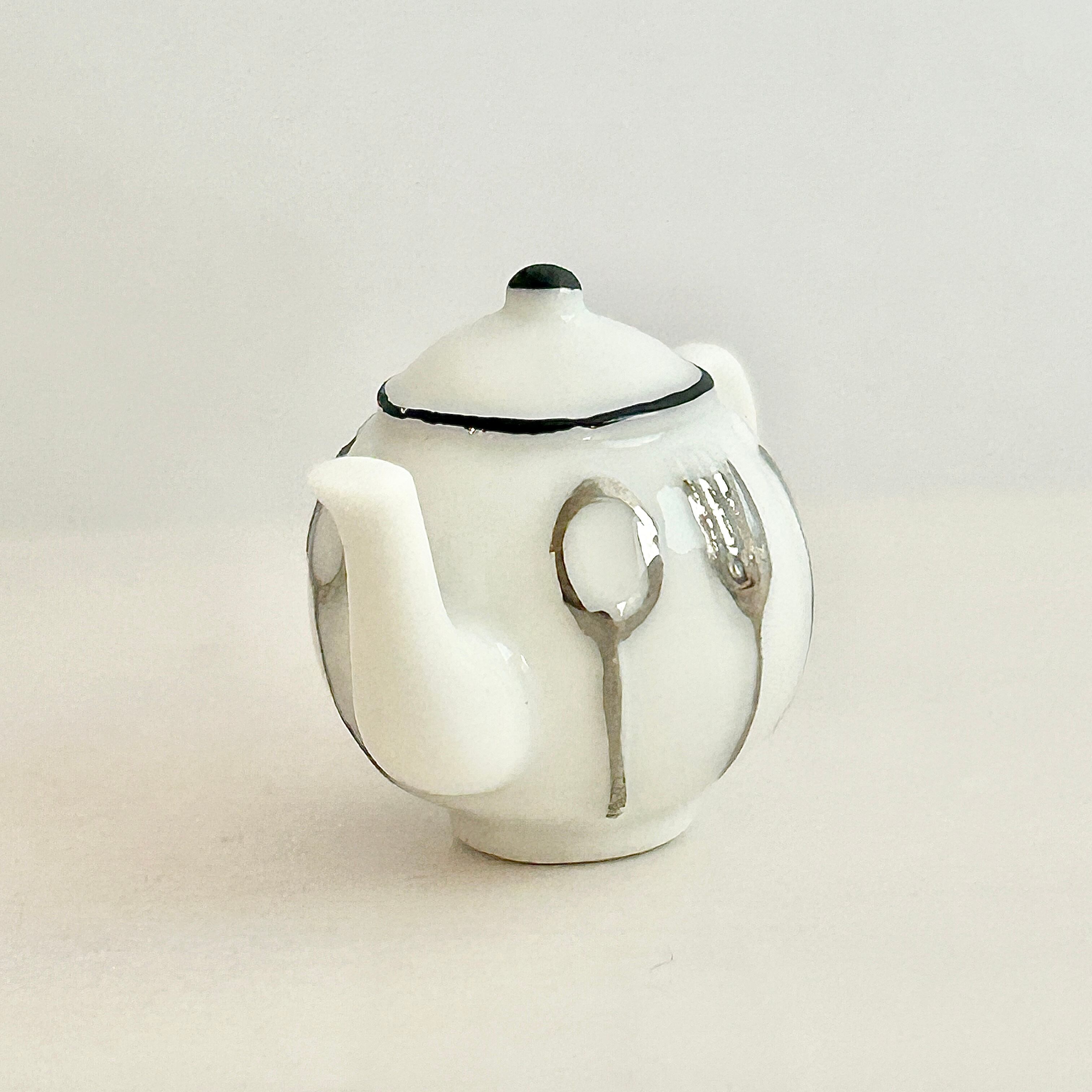 現代イギリス カトラリーのあしらわれたティーポットのフェーヴ フェーブ フランス製 ミニチュア 陶器 雑貨 置物