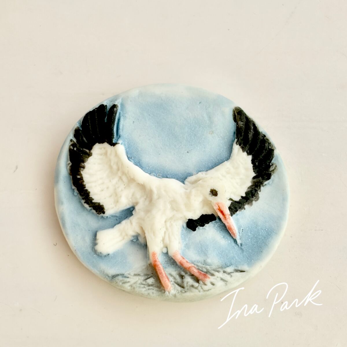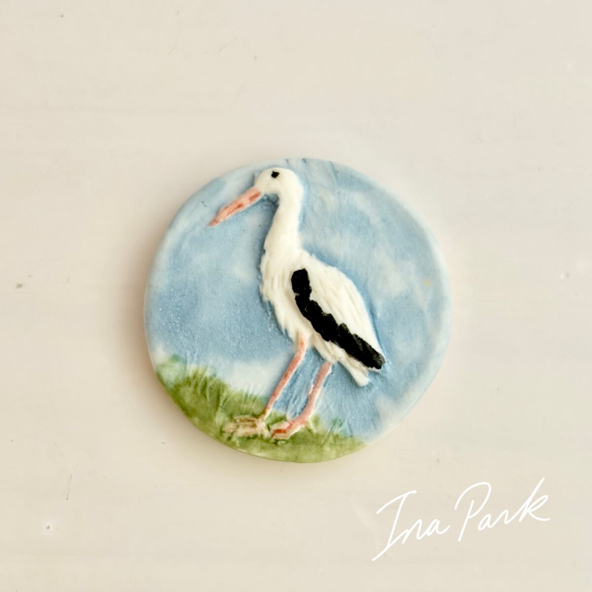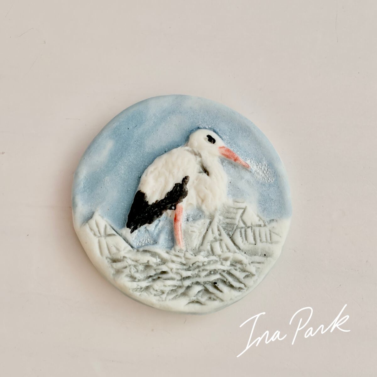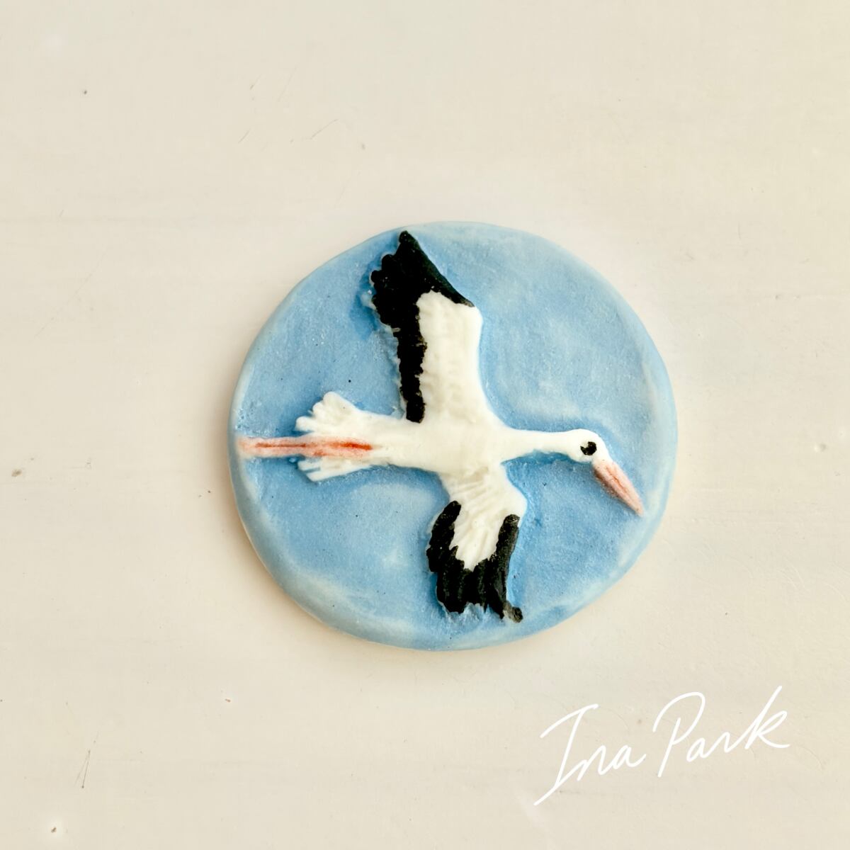 コウノトリはヨーロッパ、とりわけフランスのアルザス地方では、幸運や家族、再生を象徴する鳥として古くから親しまれてきました。青い背景に、白いコウノトリが浮き上がったデザインです。