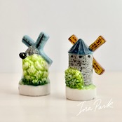 扉や窓の配置やデザインなども細かいところまで丁寧に作られており、建築物のミニチュアとして見応えのある、面白い作品です。ひとつだけ回っている表現の風車もユニークです。