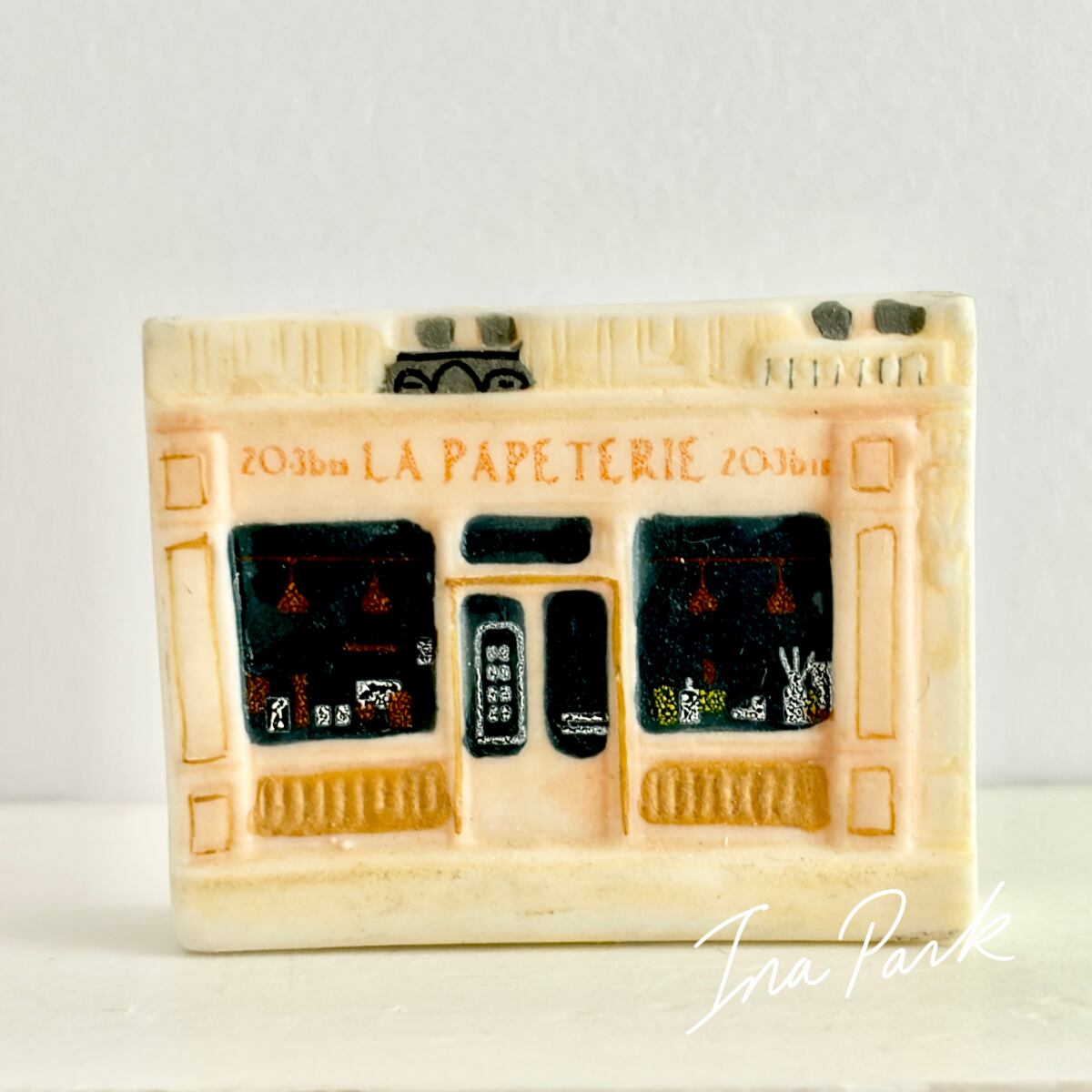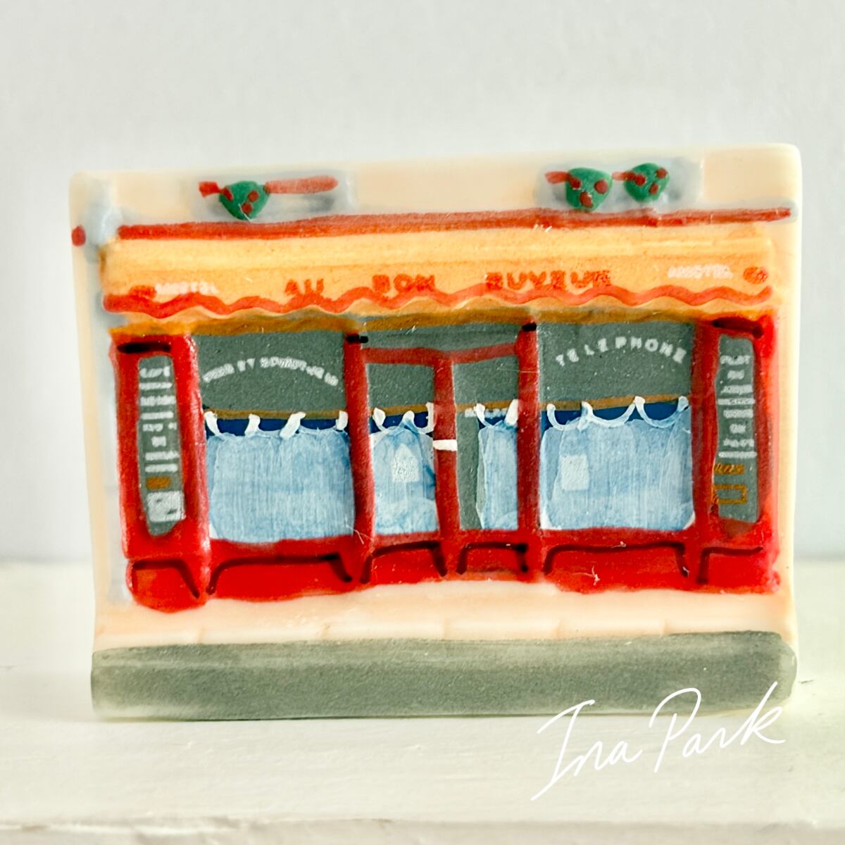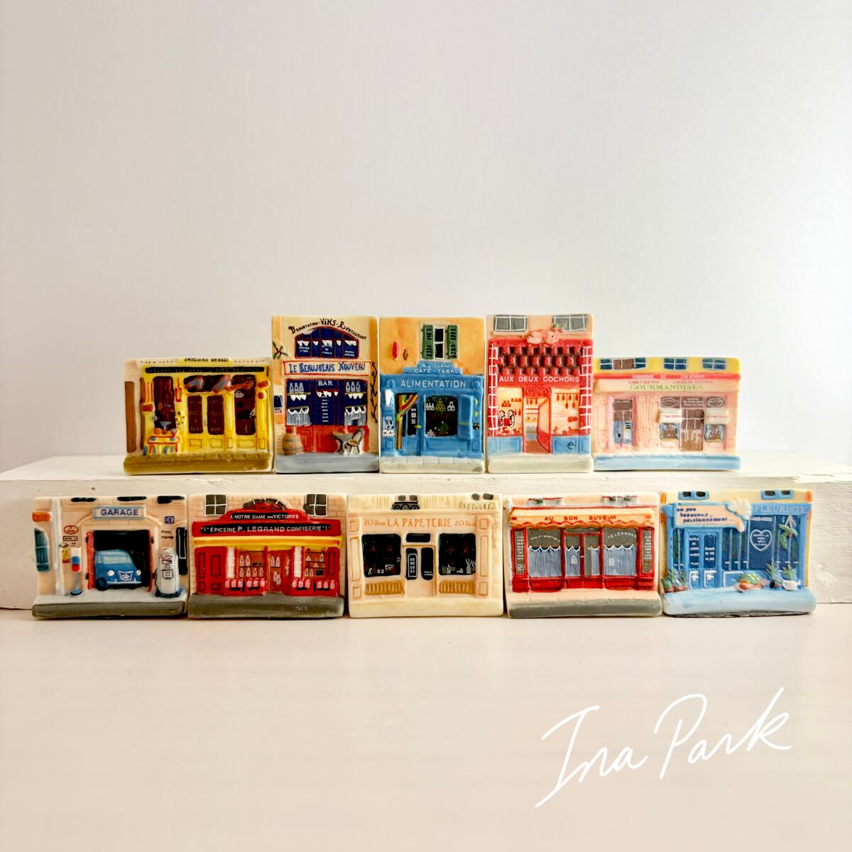 手押し車や、カフェテーブルなど、店舗前に置かれたものがところどころ立体になっているところもとても魅力的です。並べると商店街のようになって、前に人や乗り物を置いても楽しいです。→最後の写真