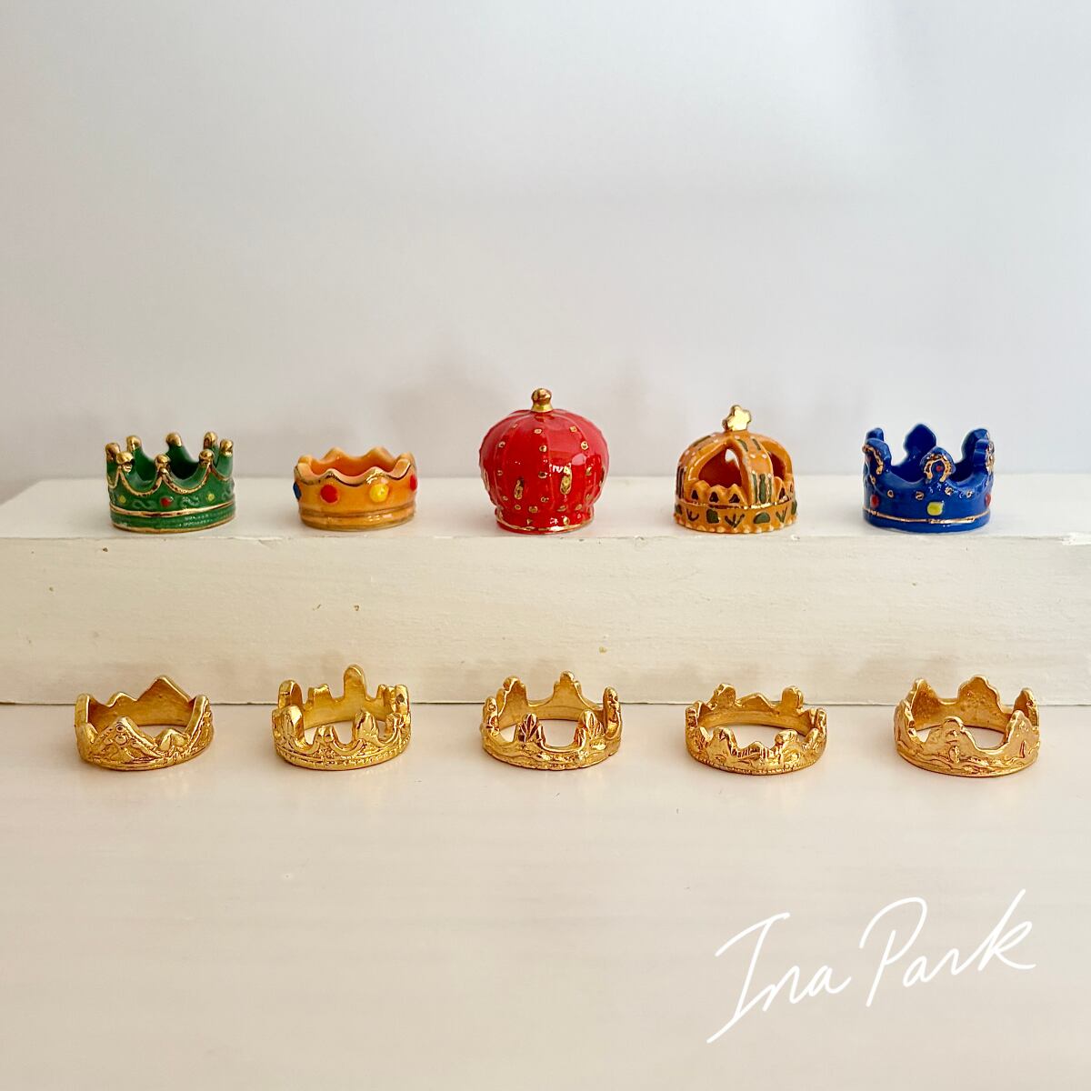 王冠といえば平たいものが主流でしたが、立体的で指にも嵌められそうな、こちらは本物のミニチュアのよう。色のある方も金属製の方も金彩がキラキラしてとても綺麗です。