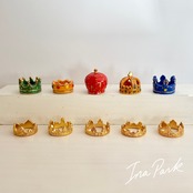 王冠といえば平たいものが主流でしたが、立体的で指にも嵌められそうな、こちらは本物のミニチュアのよう。色のある方も金属製の方も金彩がキラキラしてとても綺麗です。