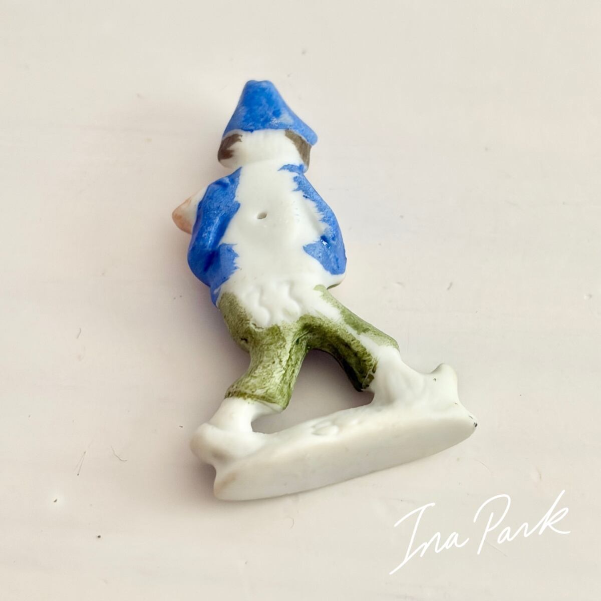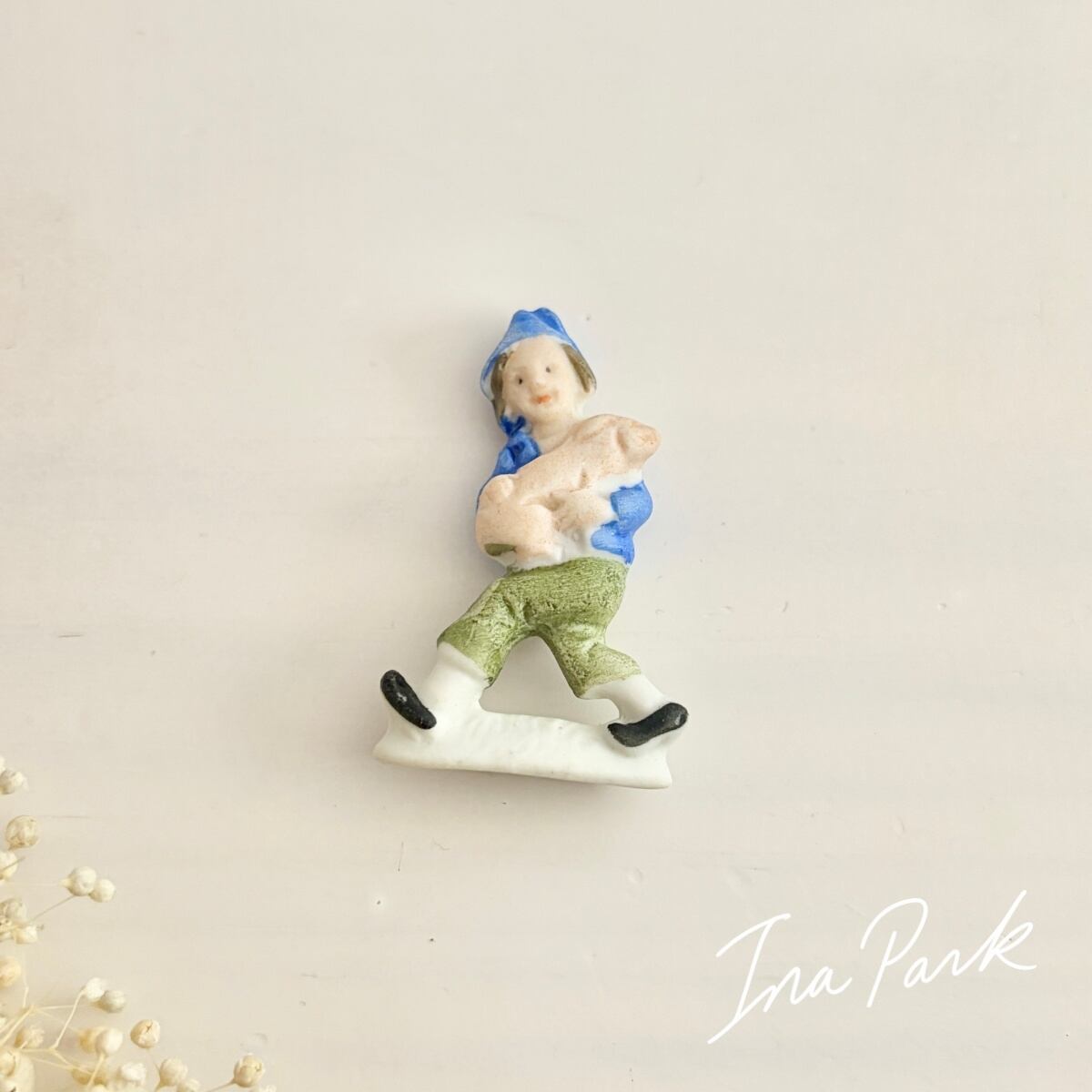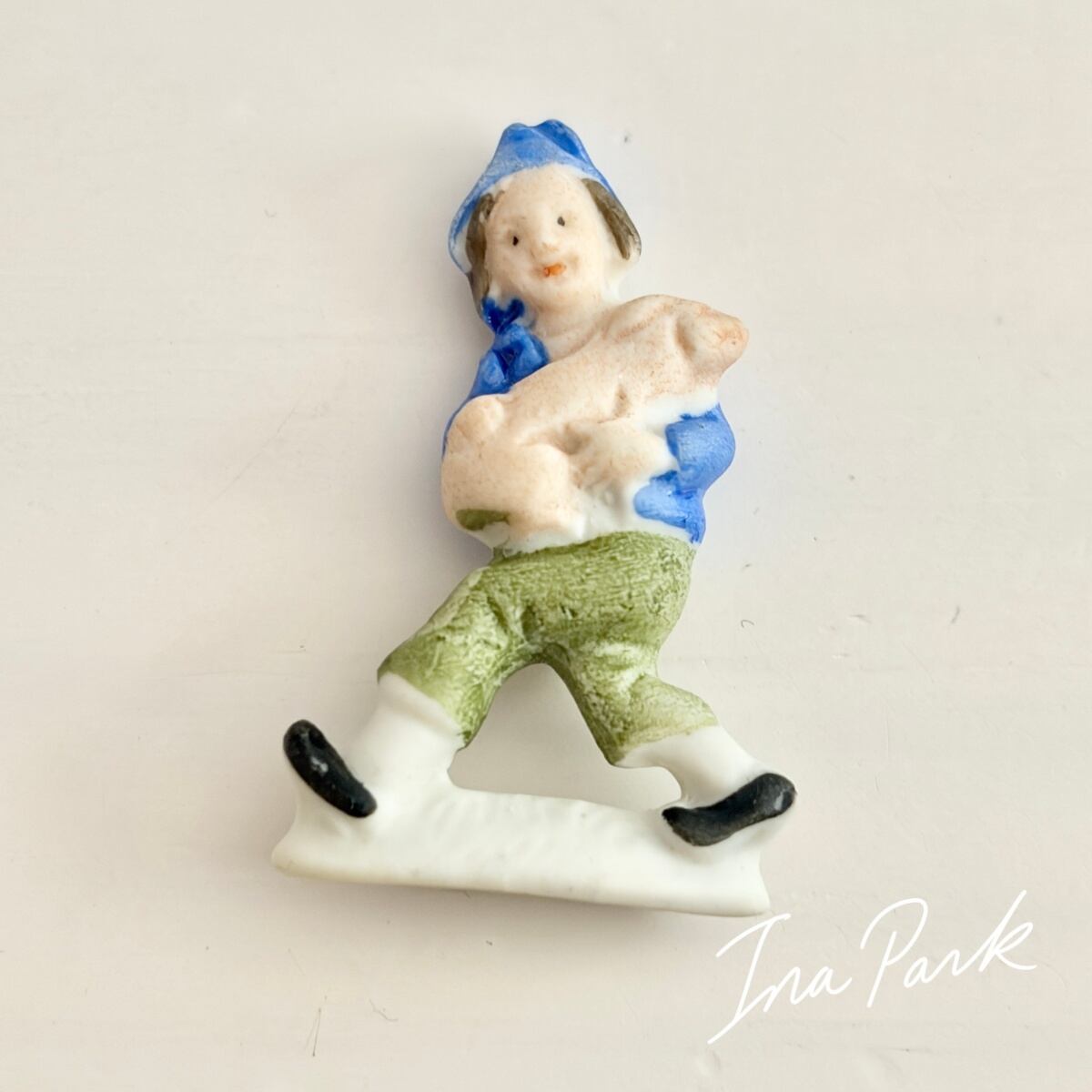ドイツ製1933-1945アンティーク フェーブ 豚を抱える少年 バッジ フェーヴ ミニチュア 陶器 雑貨