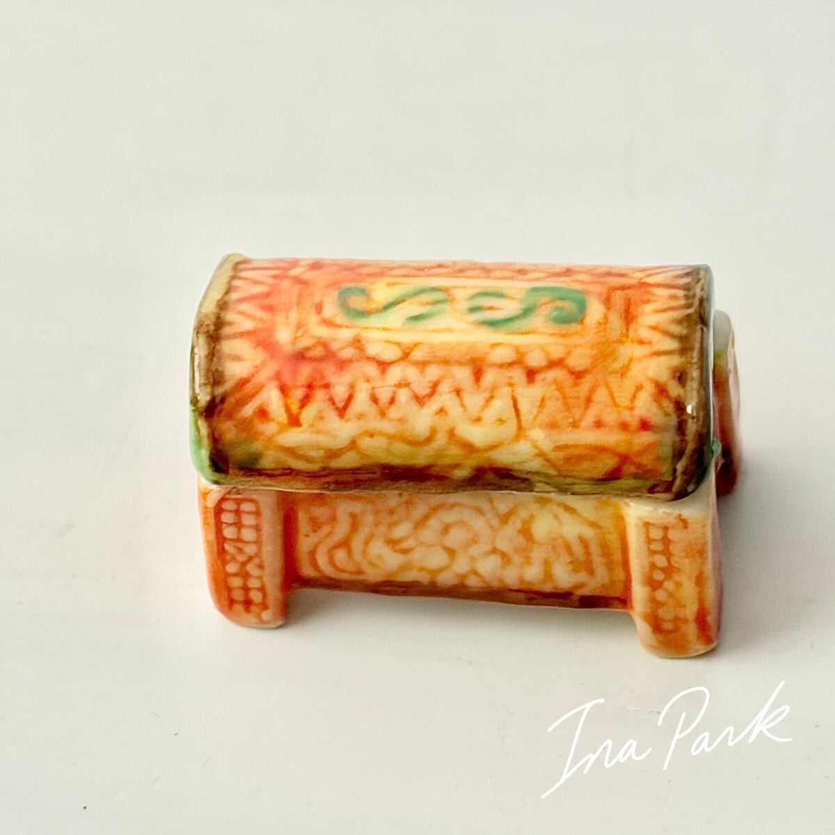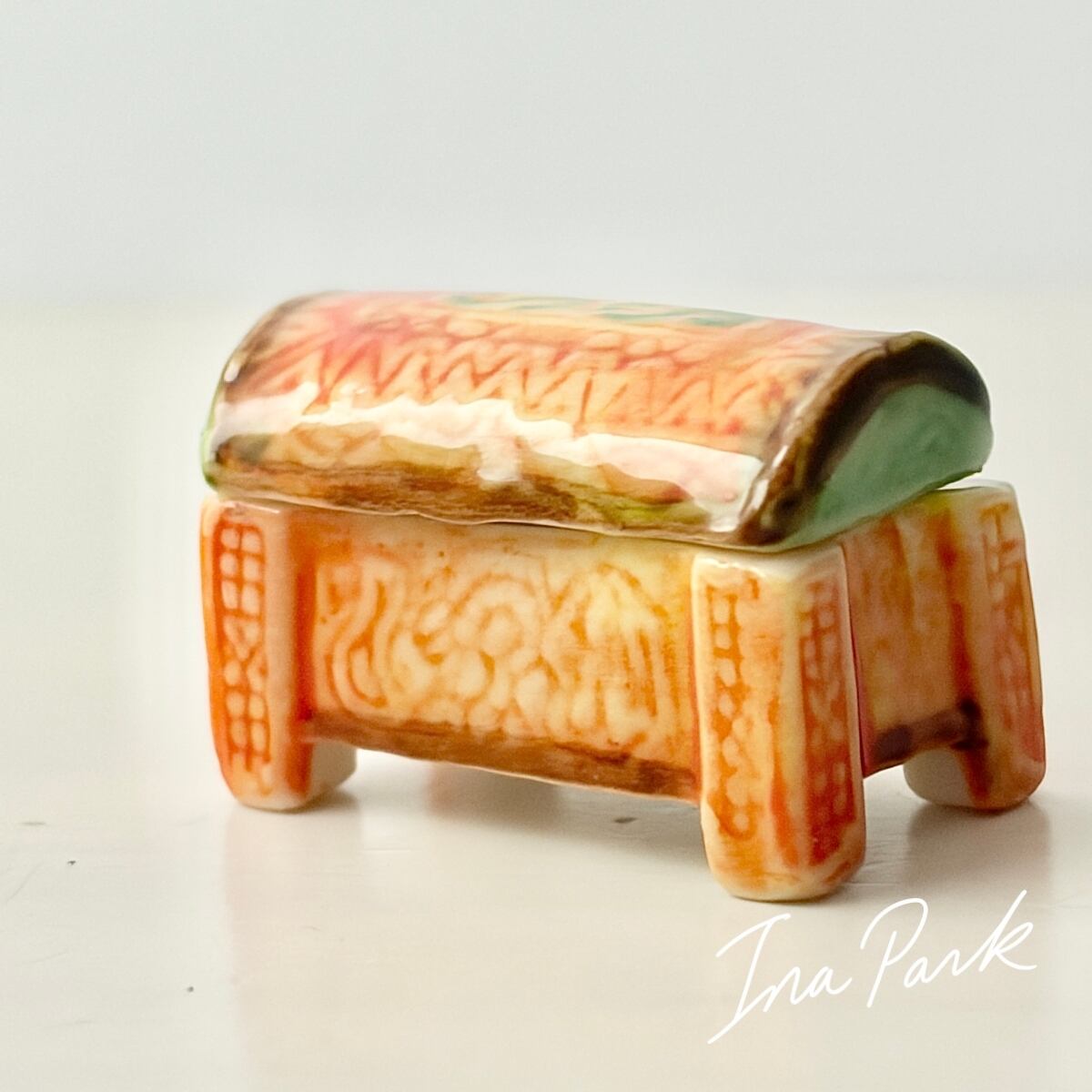 プリントではなく、ひとつひとつ模様が施され、彩色された蓋付きの小箱。