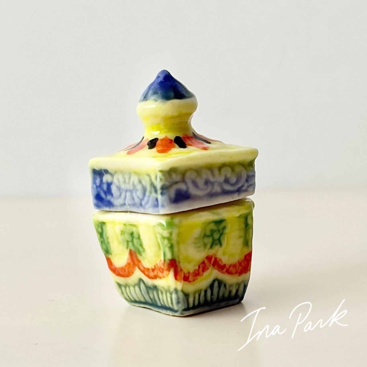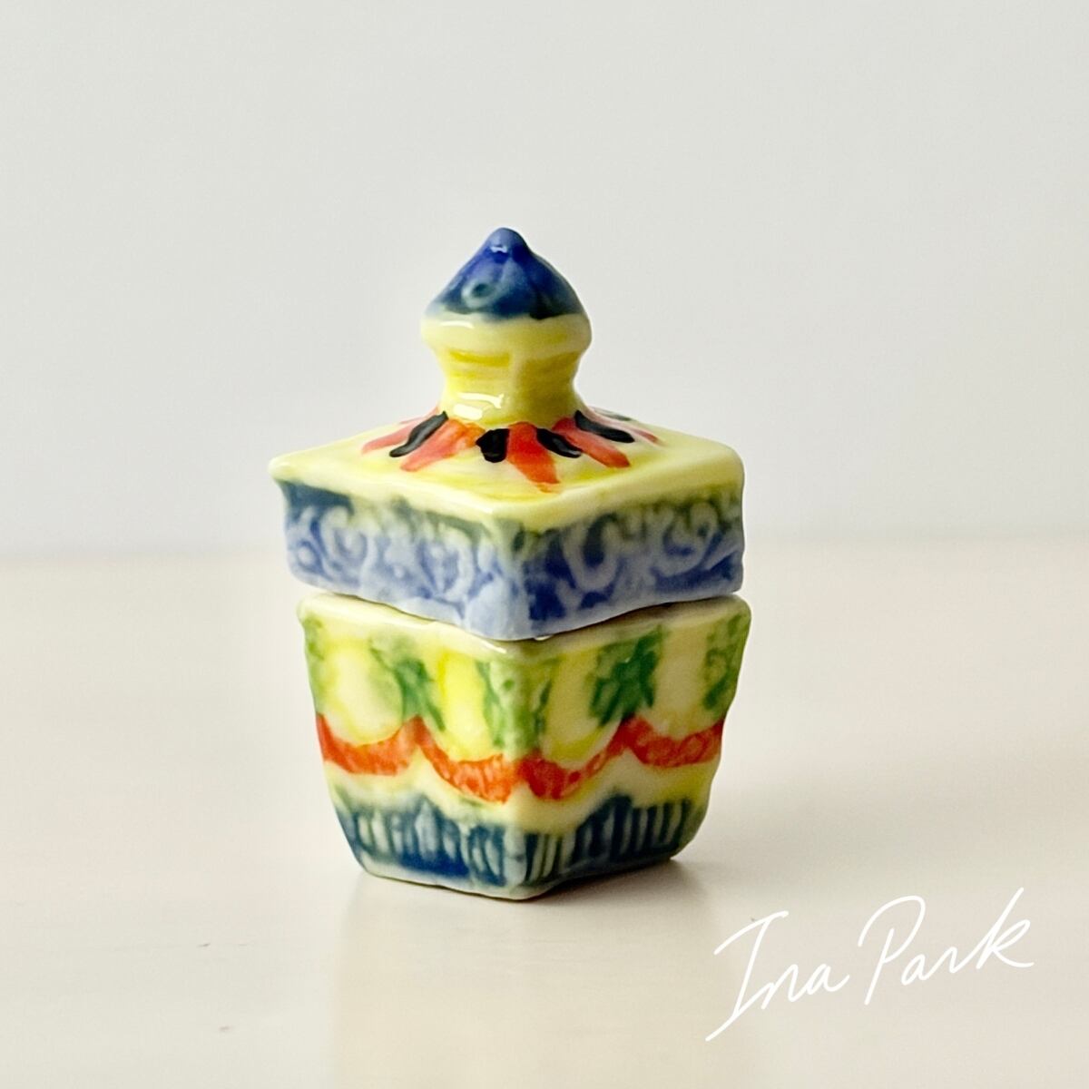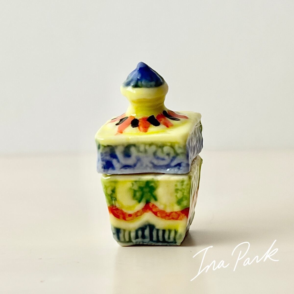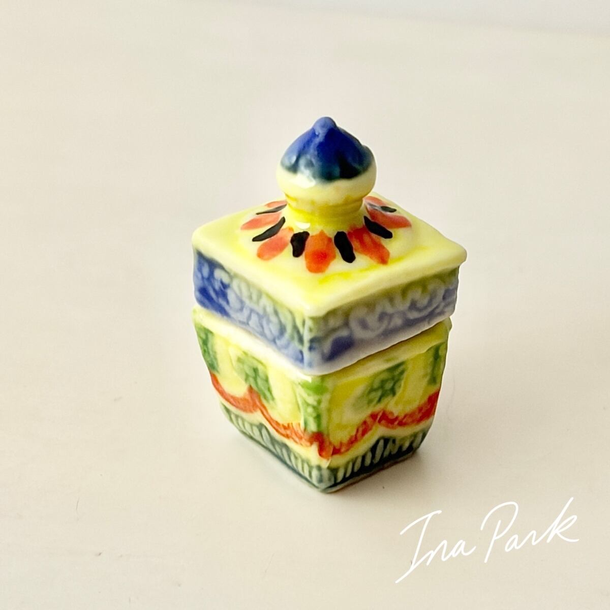 プリントではなく、ひとつひとつ模様が施され、彩色された蓋付きの小箱。