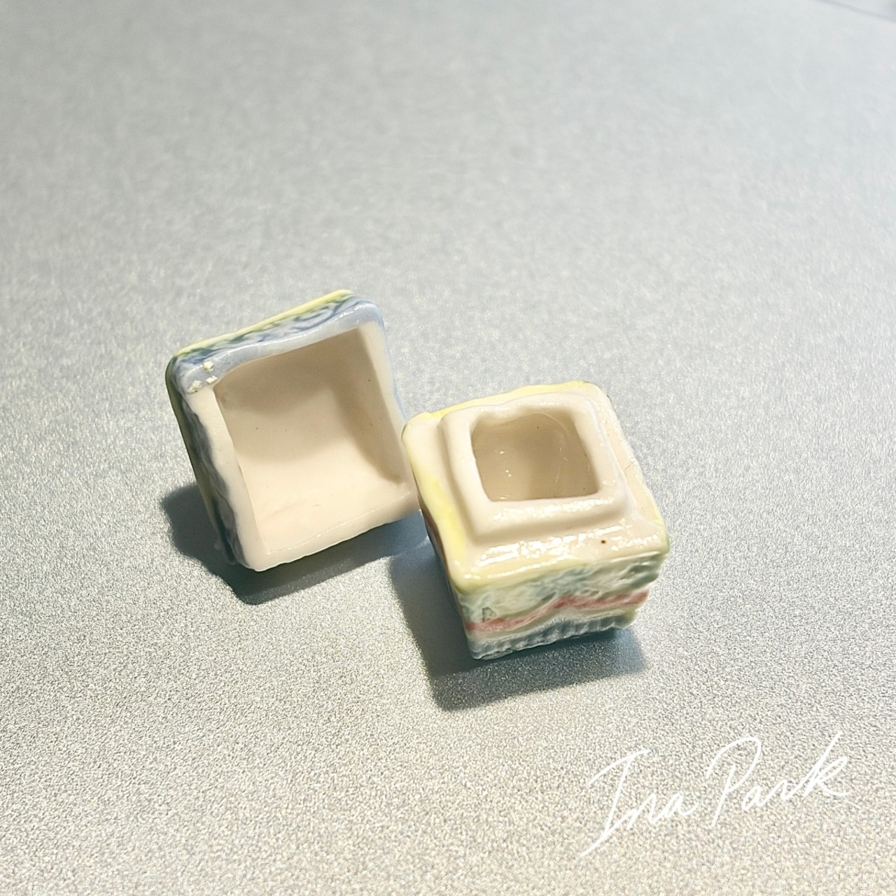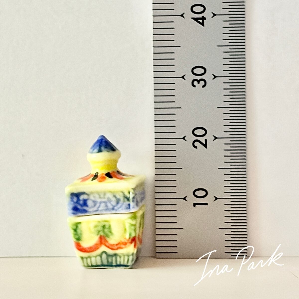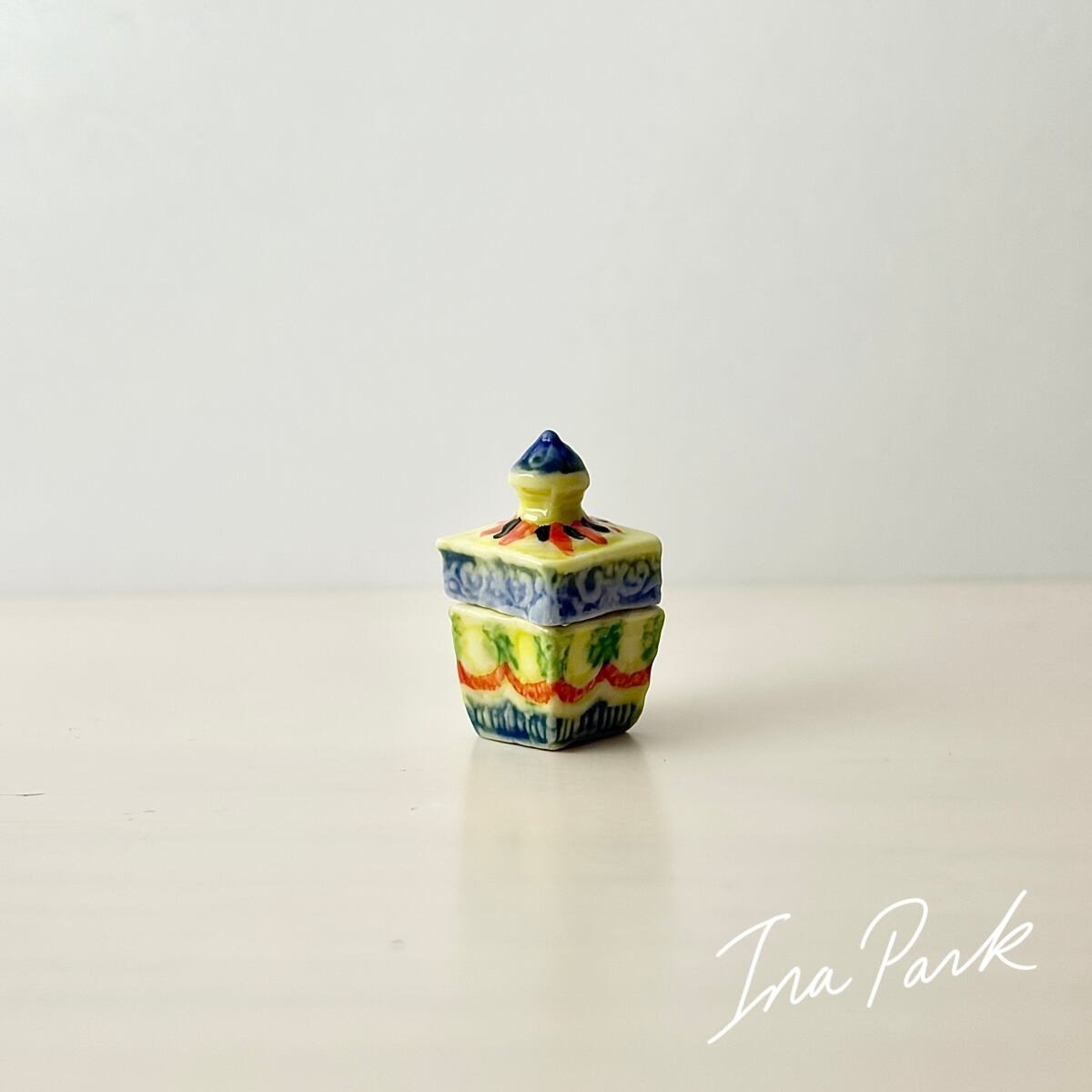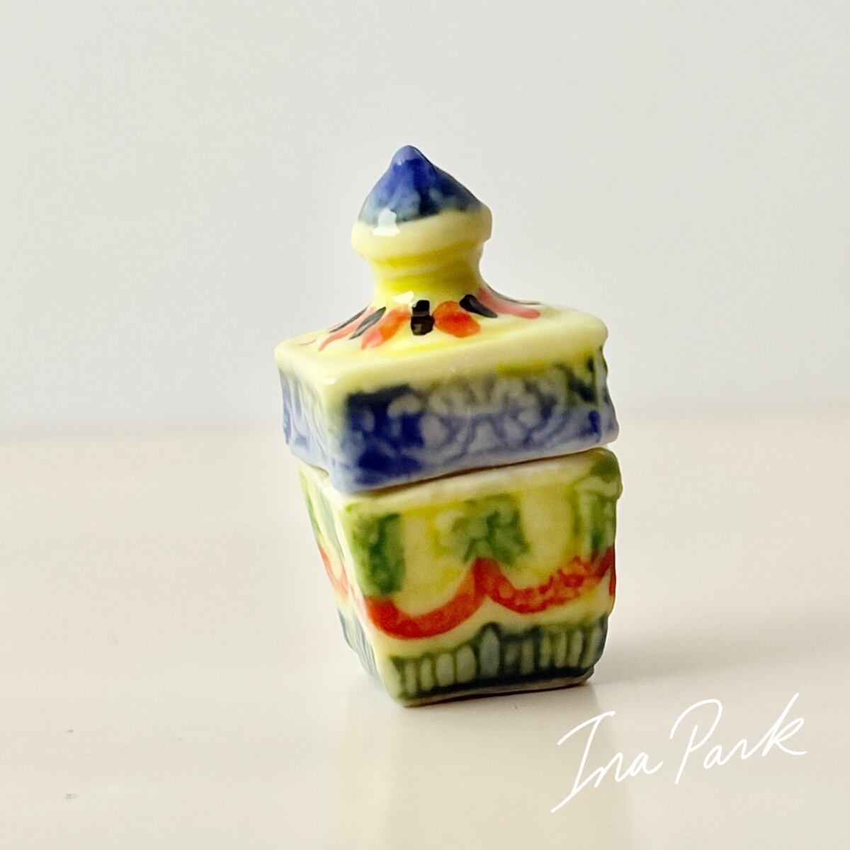 プリントではなく、ひとつひとつ模様が施され、彩色された蓋付きの小箱。