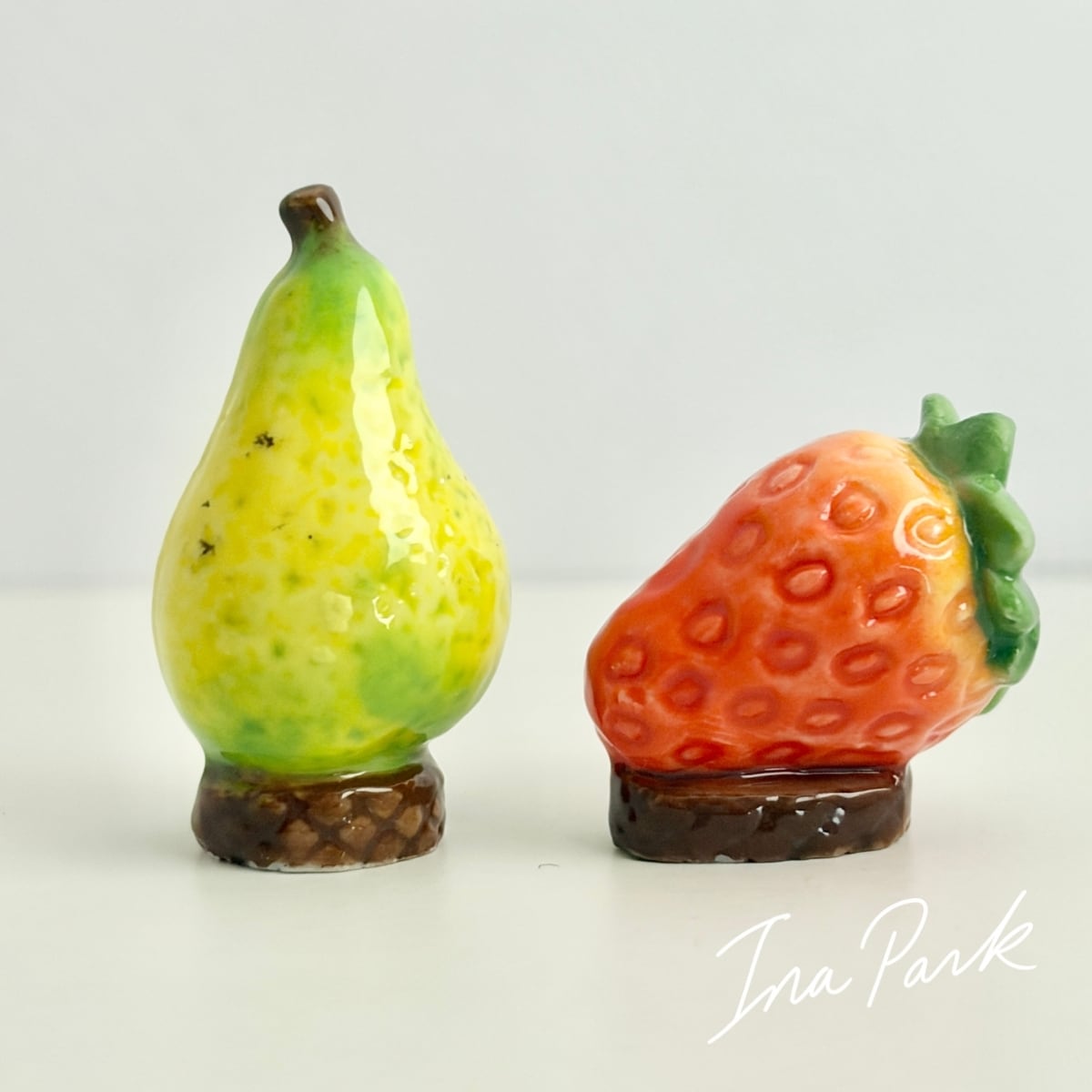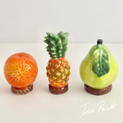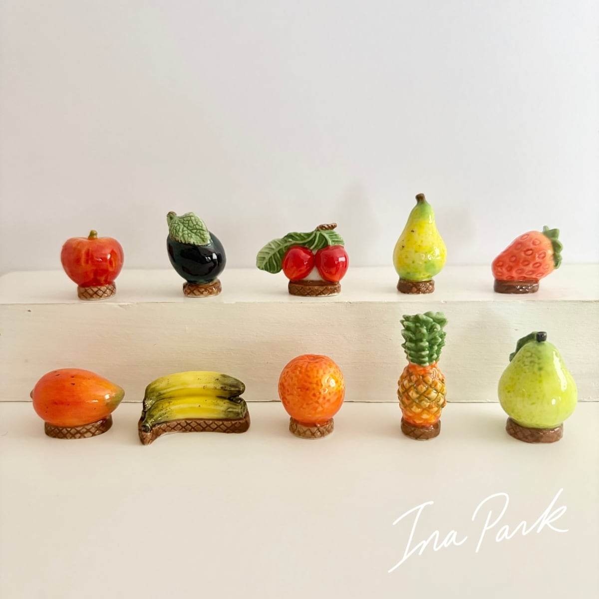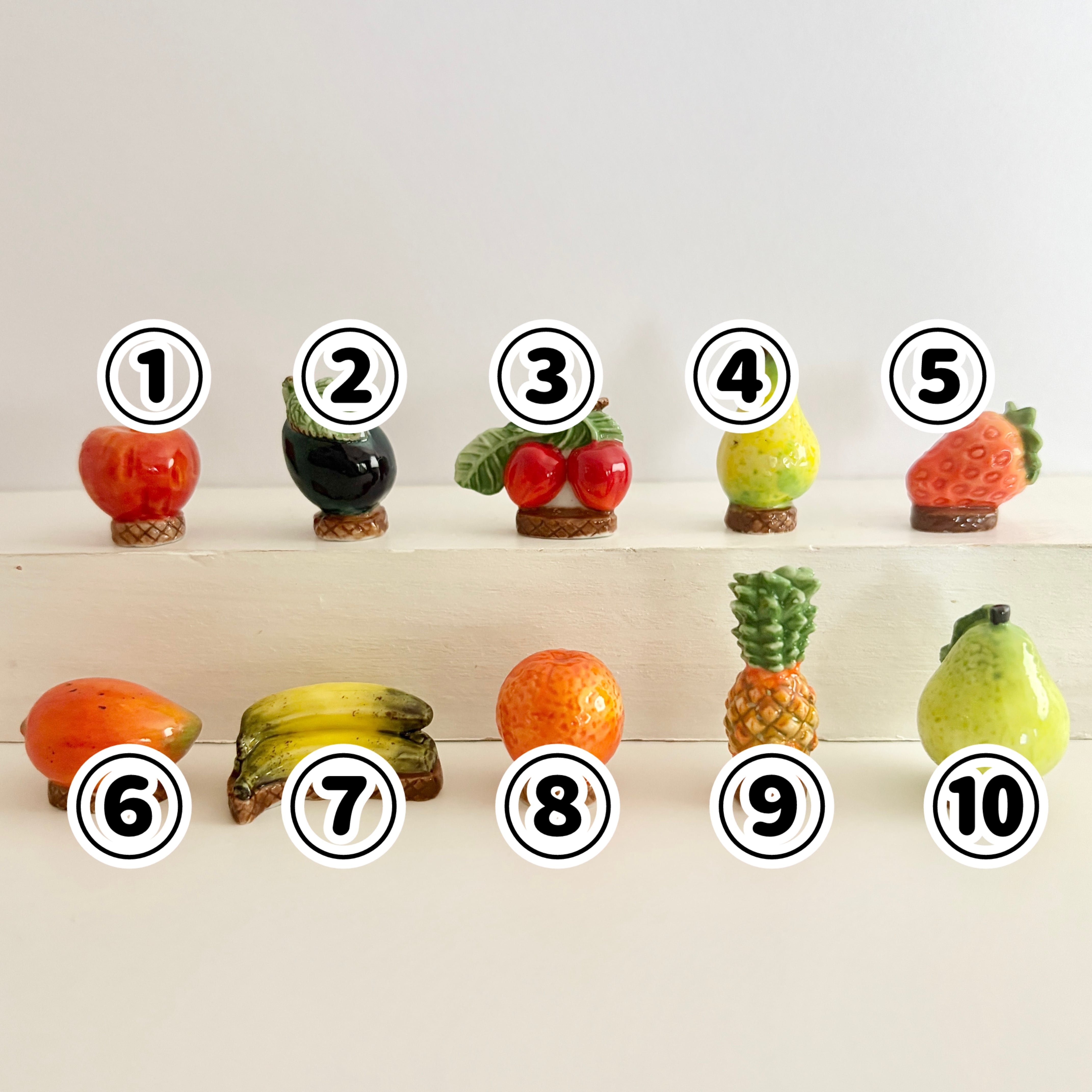イチゴ・バナナ・洋梨・マンゴー・プルーンなど、ちょっとおしゃれな台座に乗った果物のフェーヴたち。