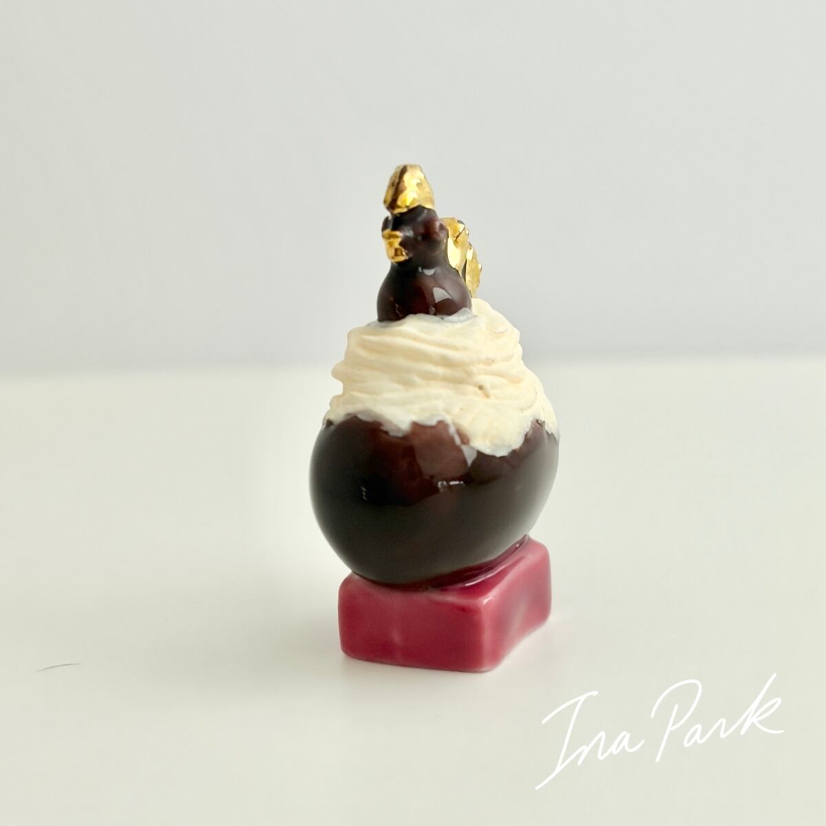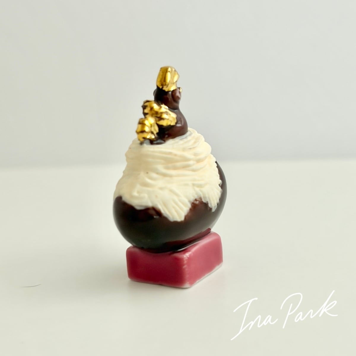 巣に見立てたクリームの上にチョコレートの鶏が乗っている、ラブリーなお菓子。