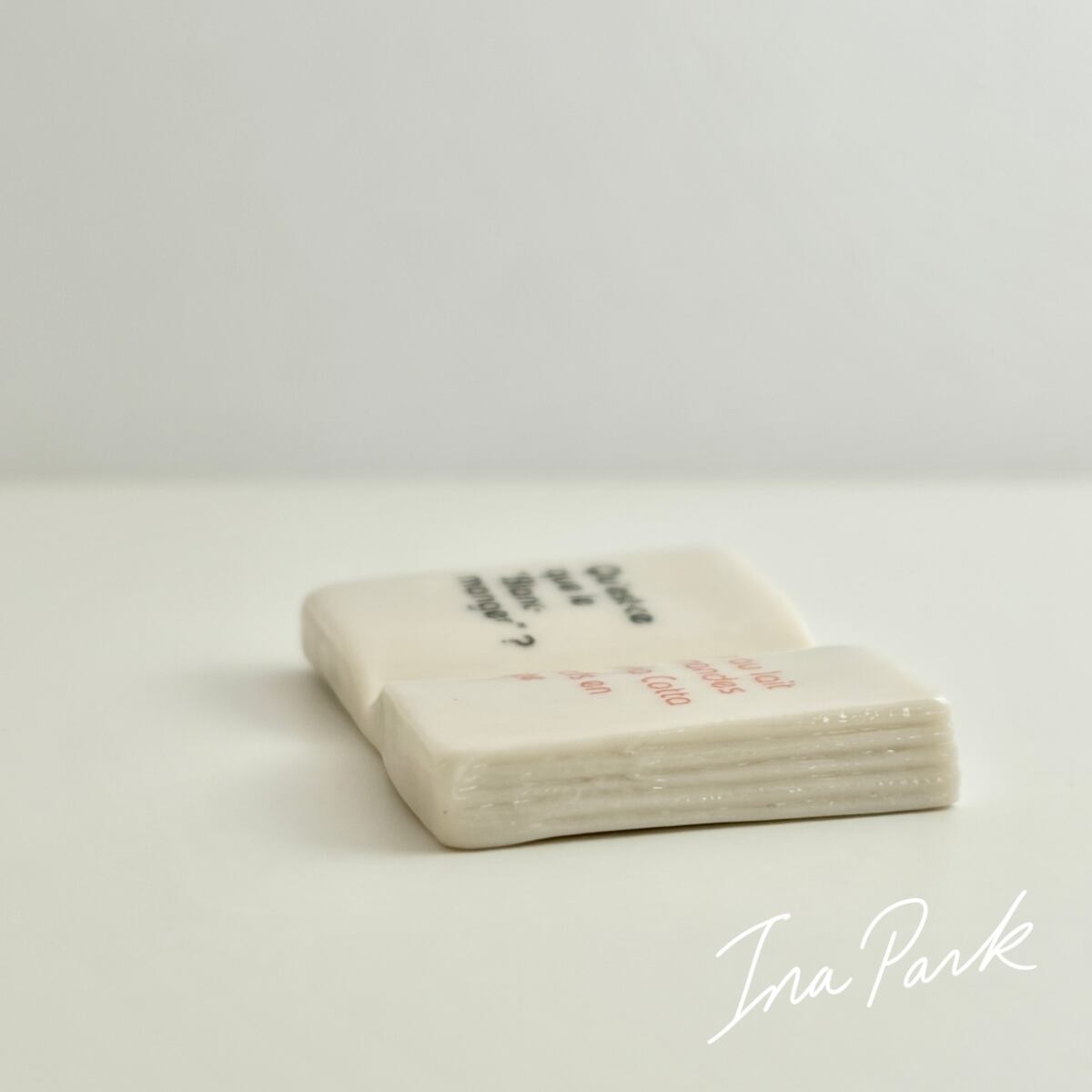 問いと、選択肢が記されたお菓子にまつわるクイズの本の形のフェーブ。