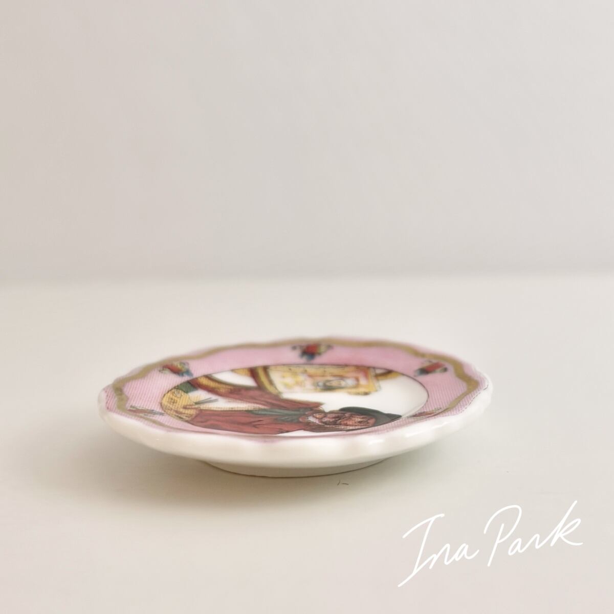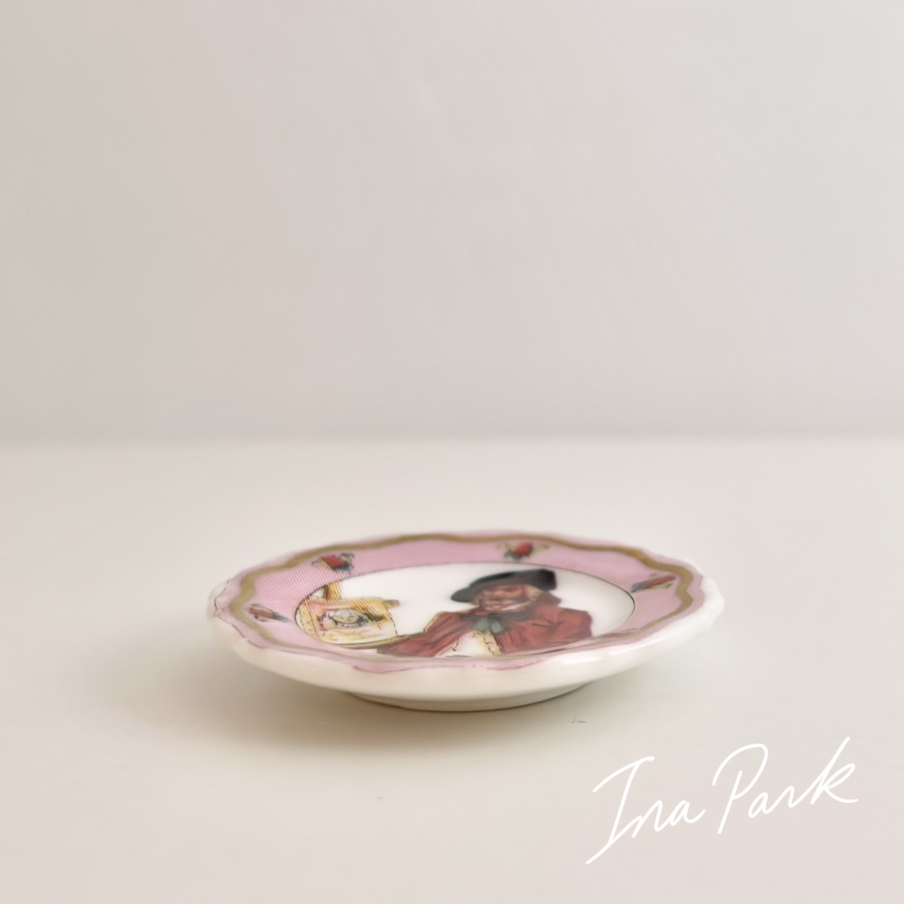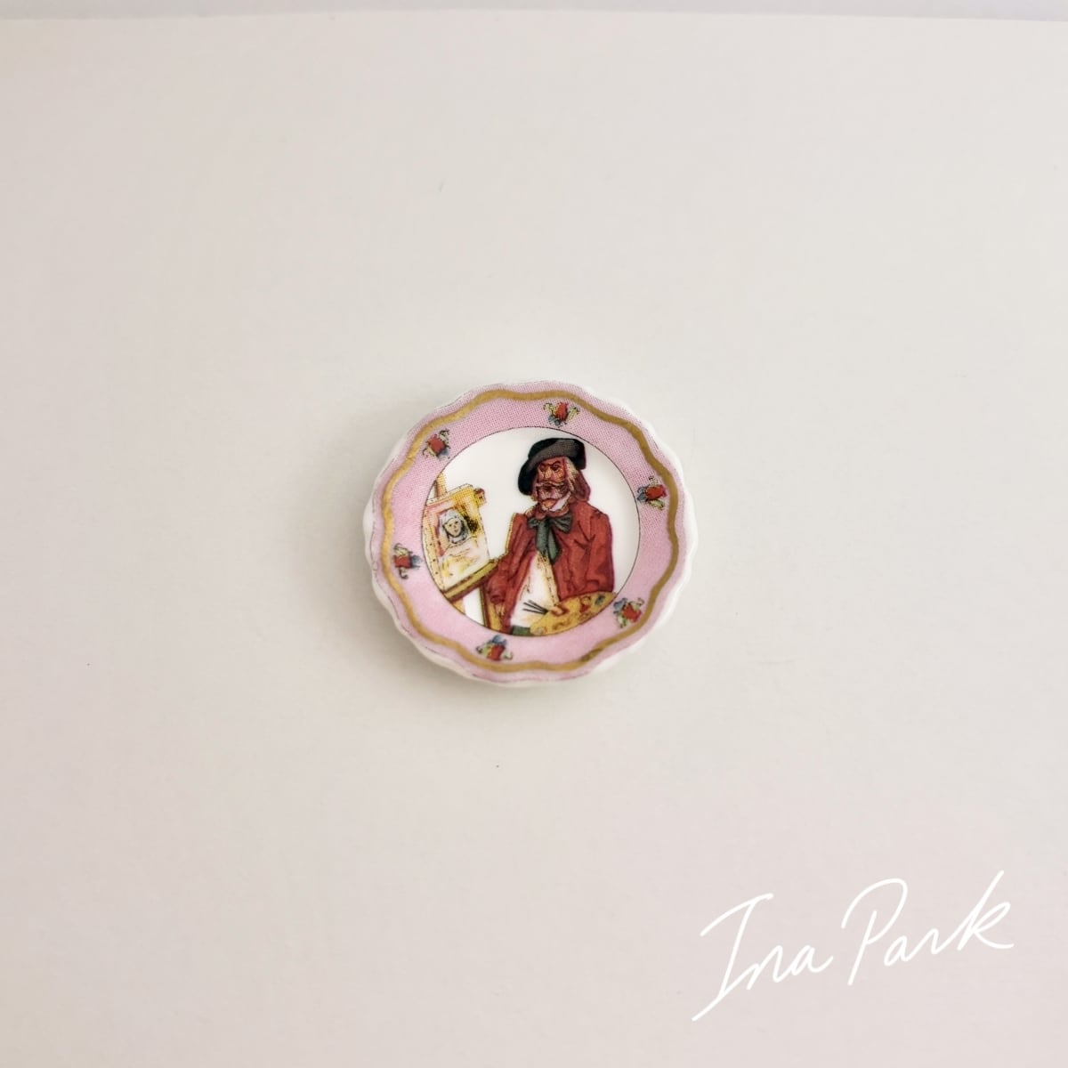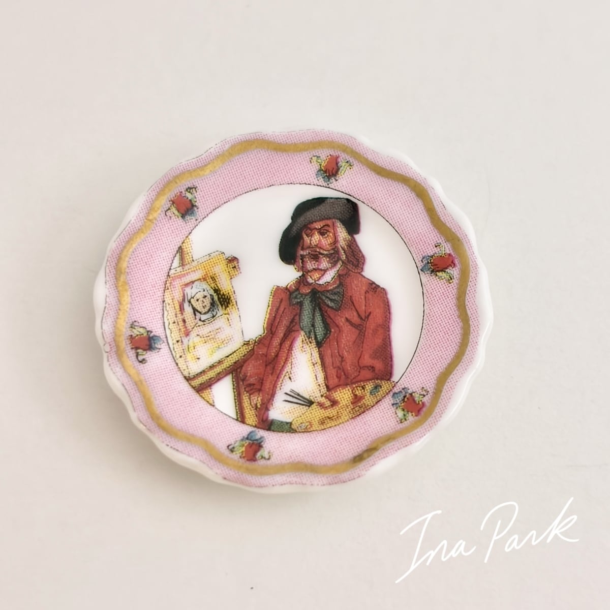 このお皿は、肖像画を描く画家を描いた飾り皿という入れ子構造のようなモチーフで大変面白いです。お皿自体も、ローズカラーと金彩で実物の方が魅力的です。。