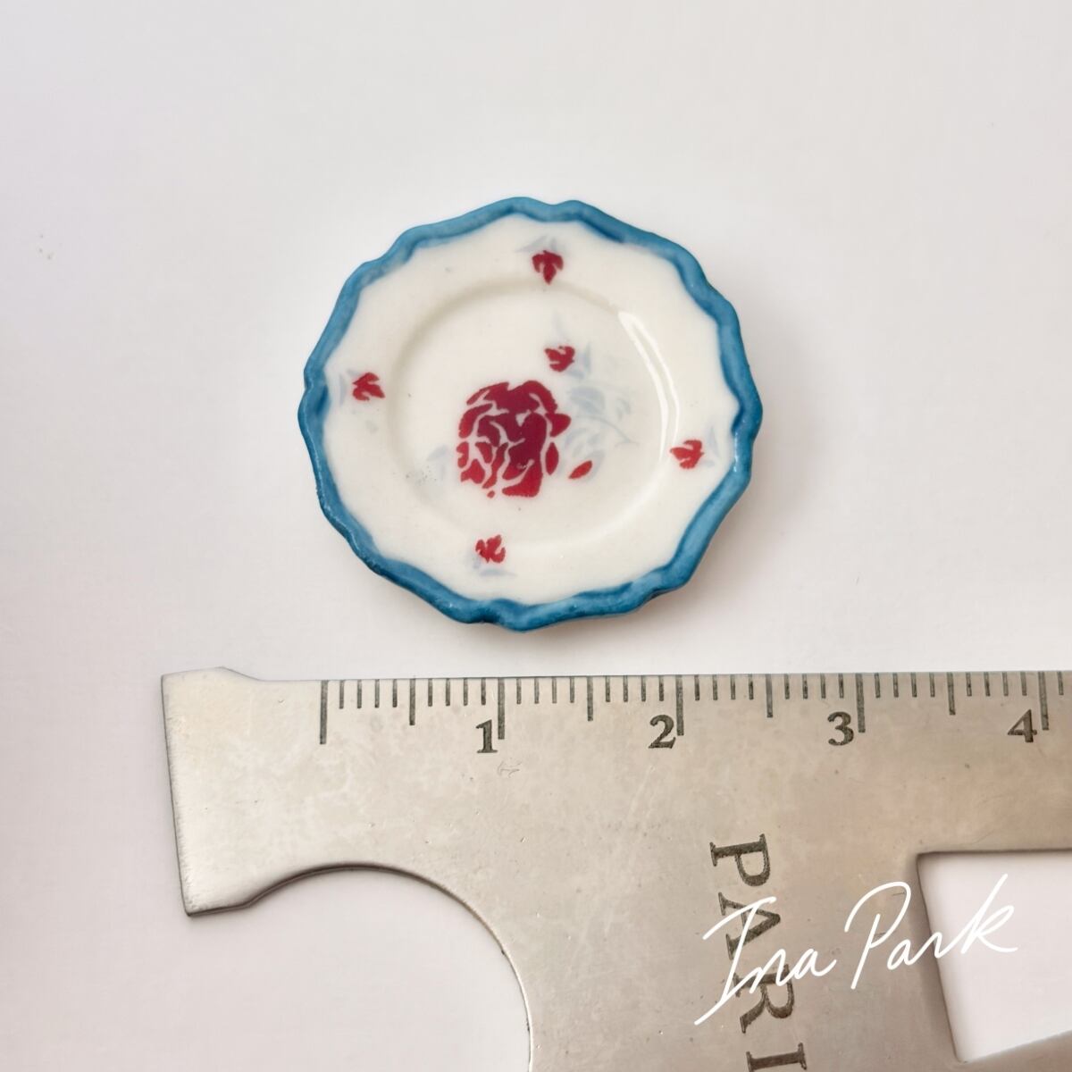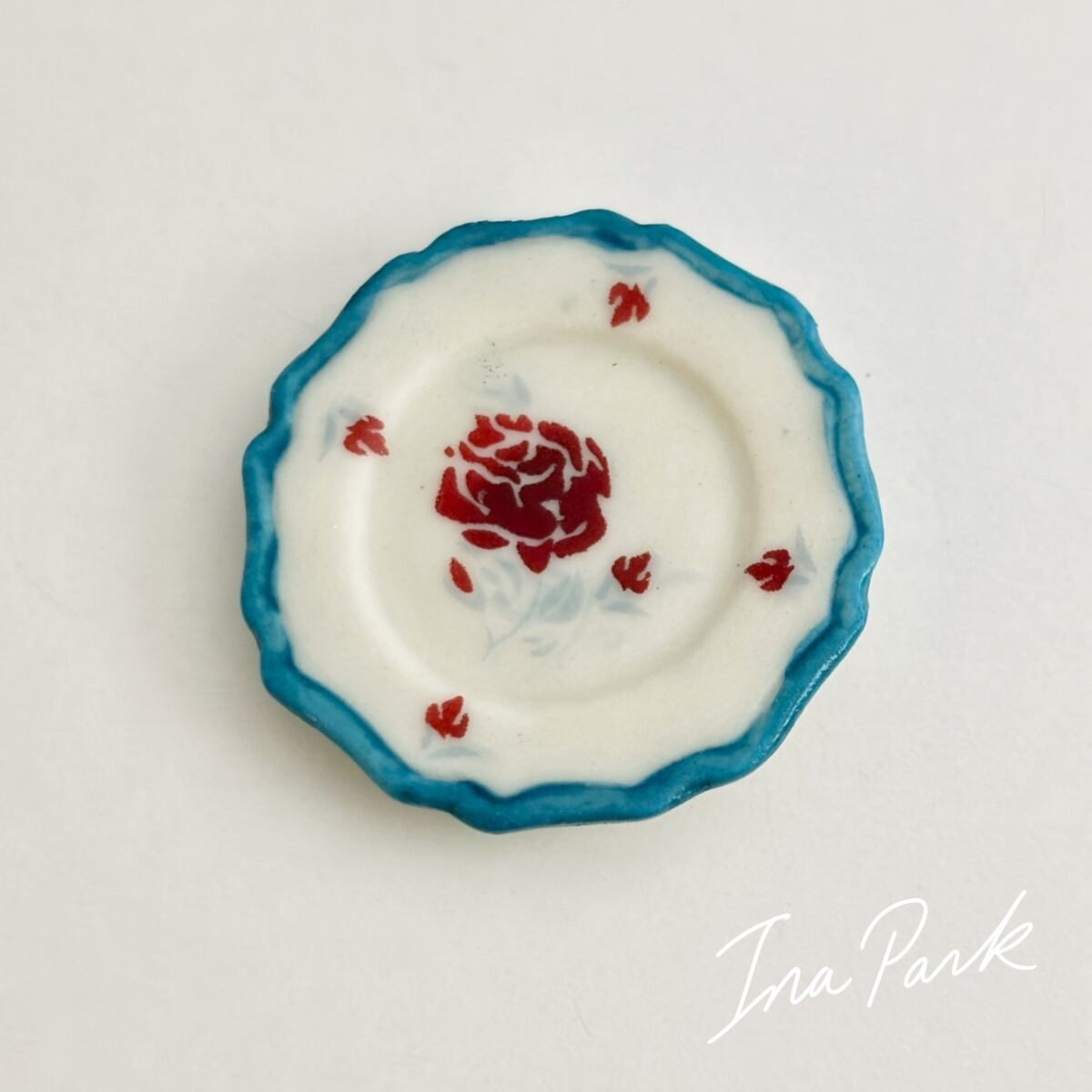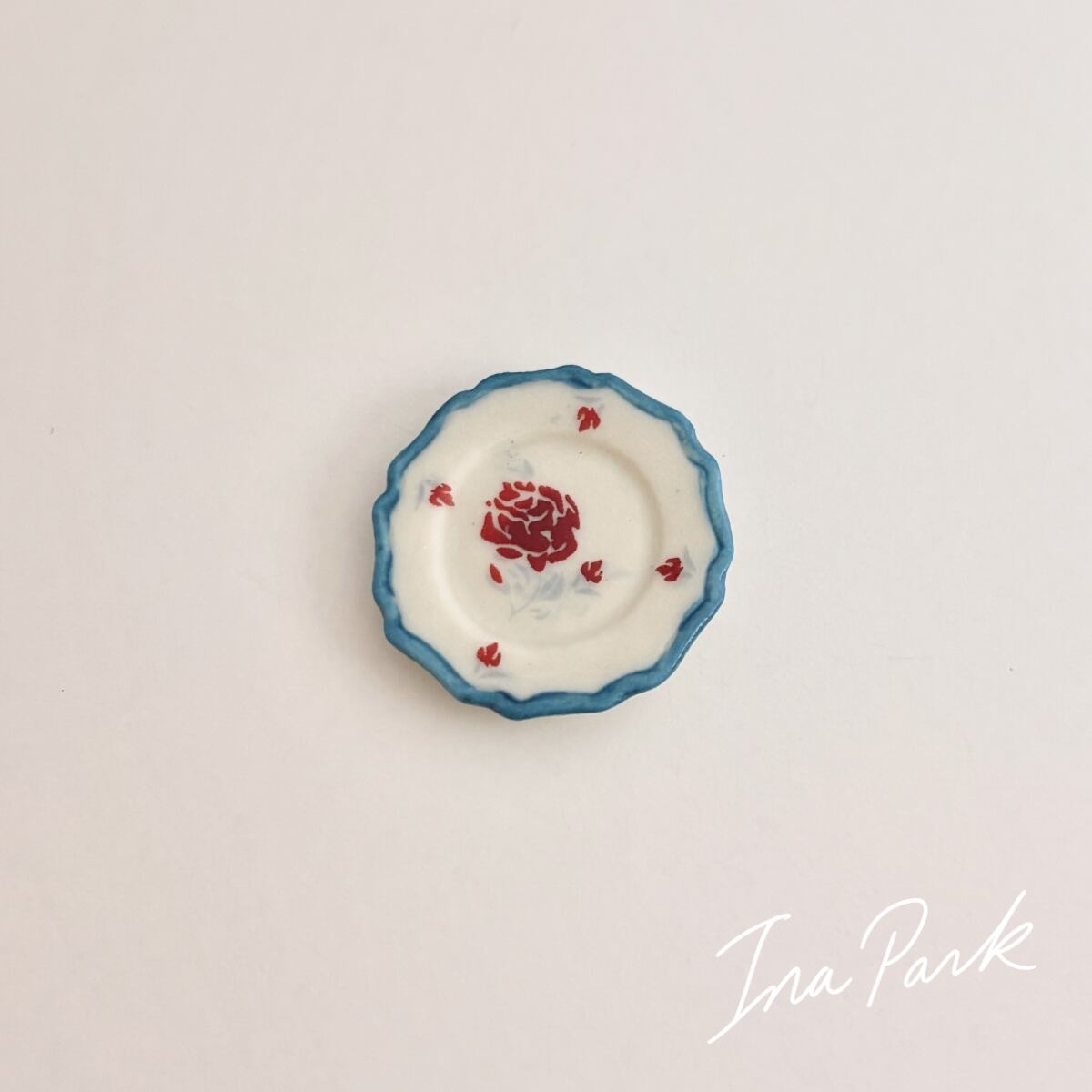 青い縁取りの薔薇の皿 フェーヴ フェーブ フランス製 ミニチュア 陶器 雑貨 置物