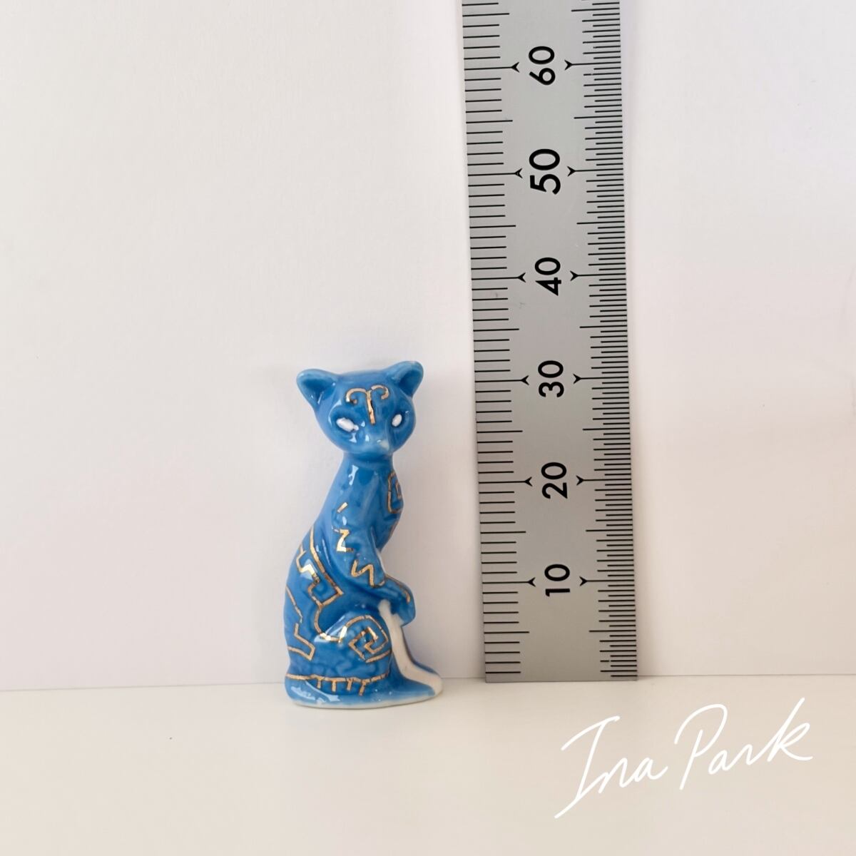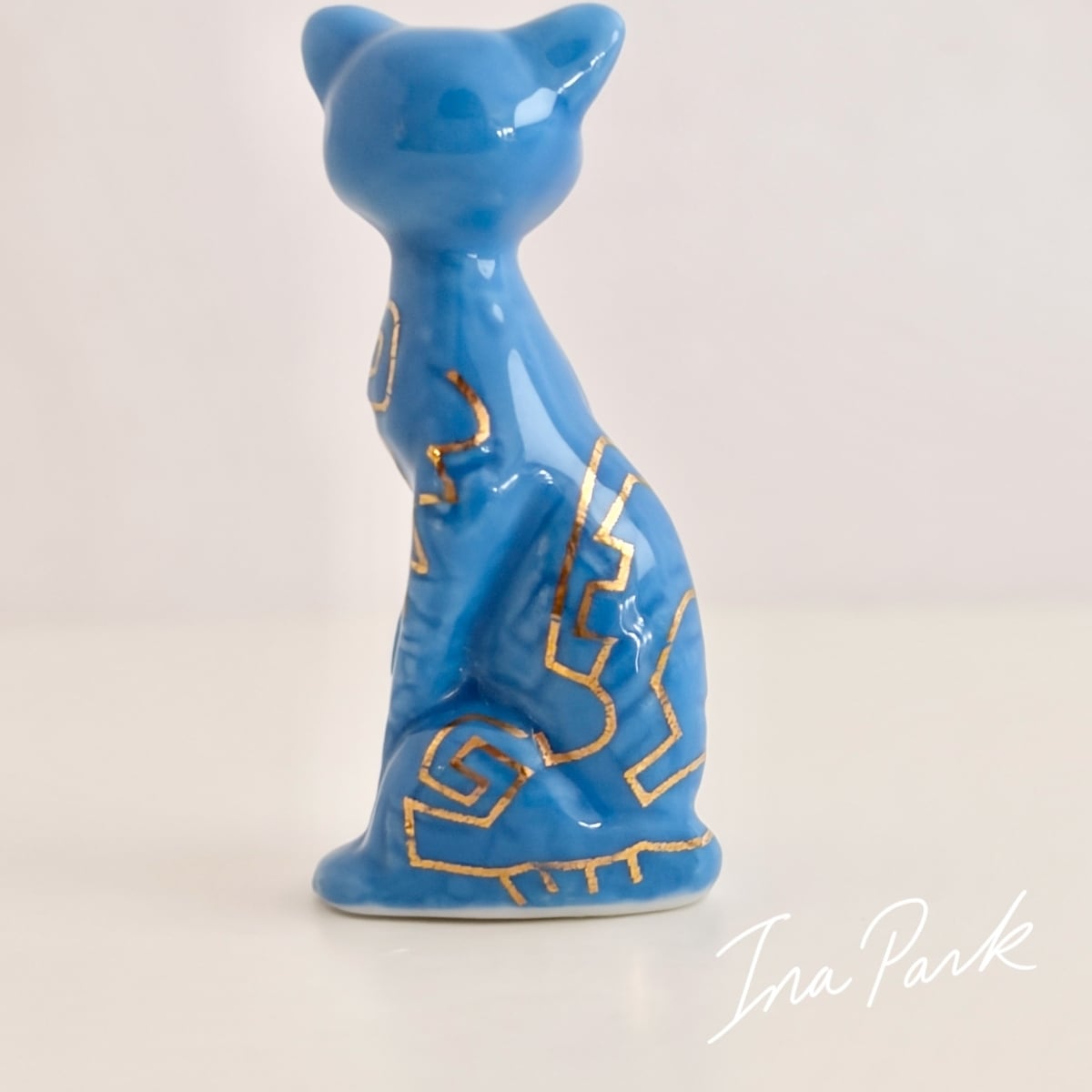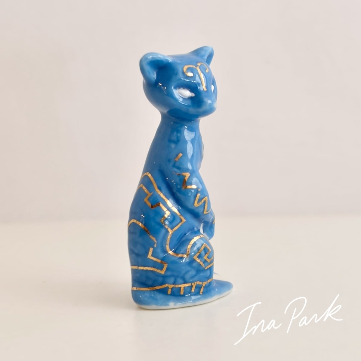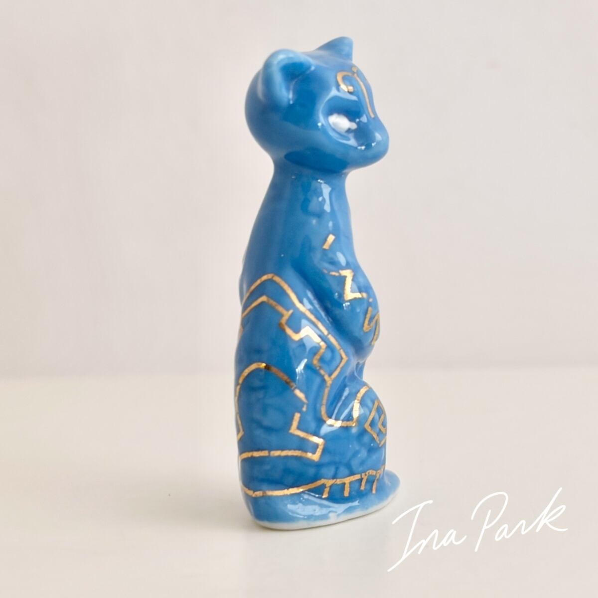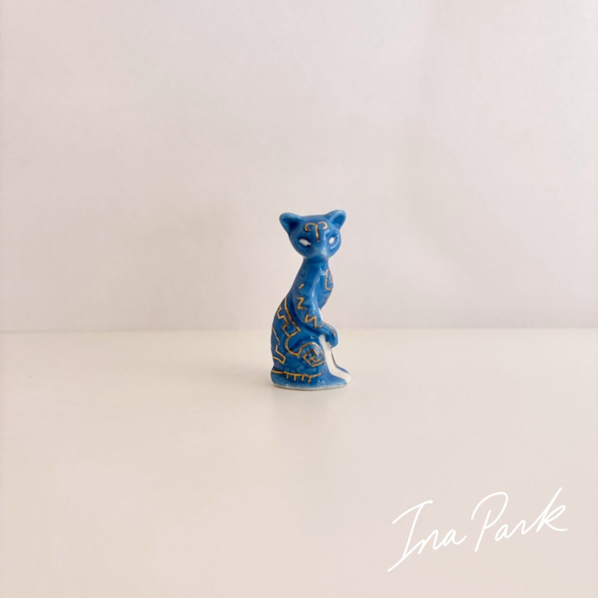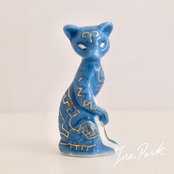 神秘的な柄の青いネコ 猫 フェーブ フランス製 ミニチュア 陶器 雑貨 置物