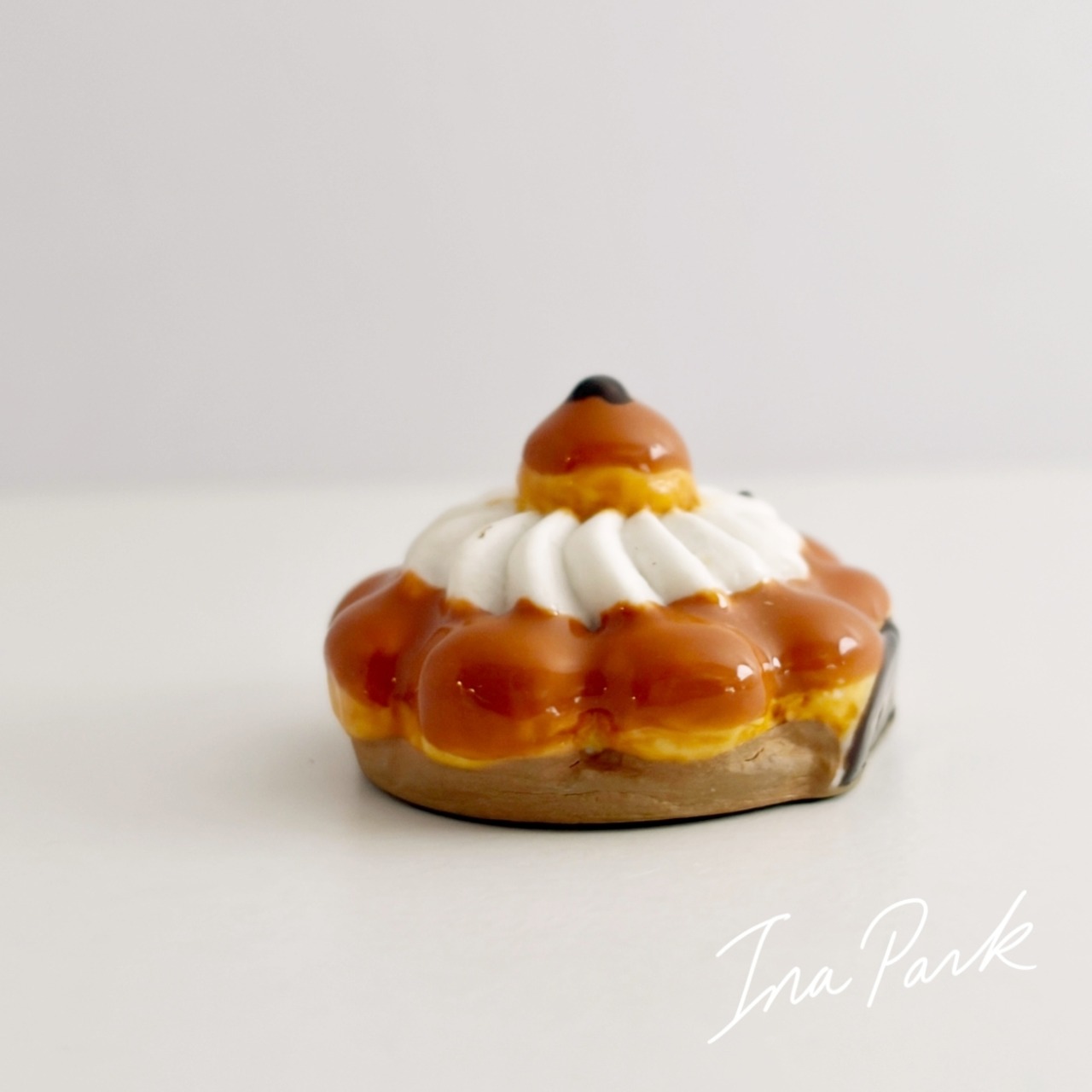 シューにはキャラメルがけが施され、中心には軽いクリームが絞られます。