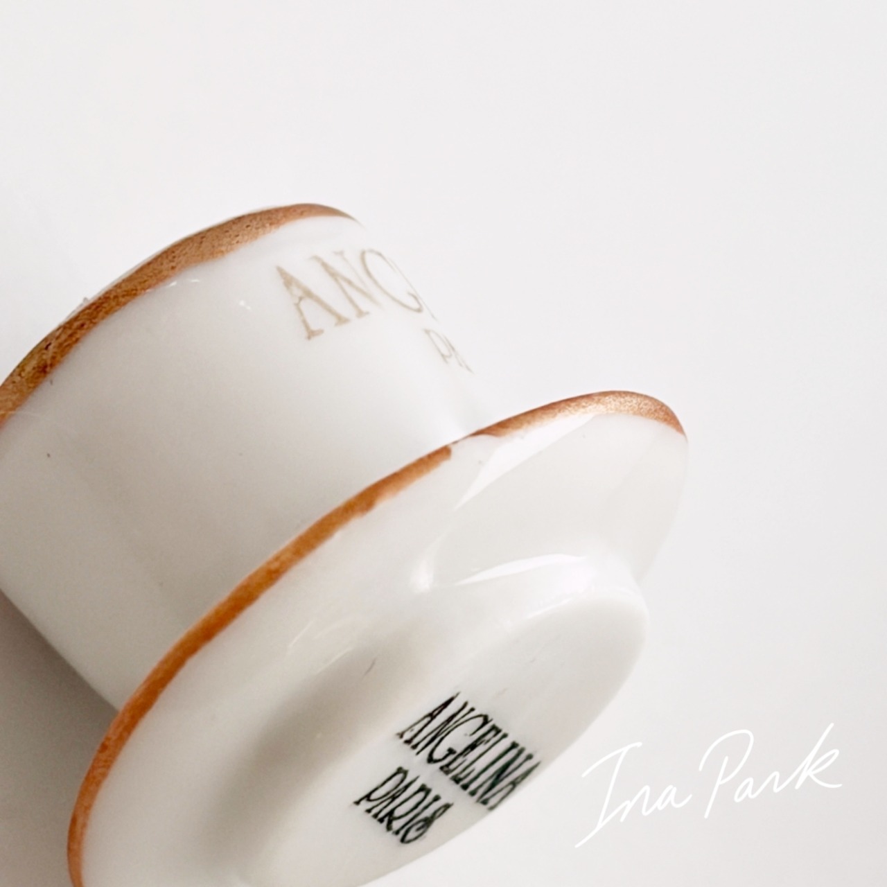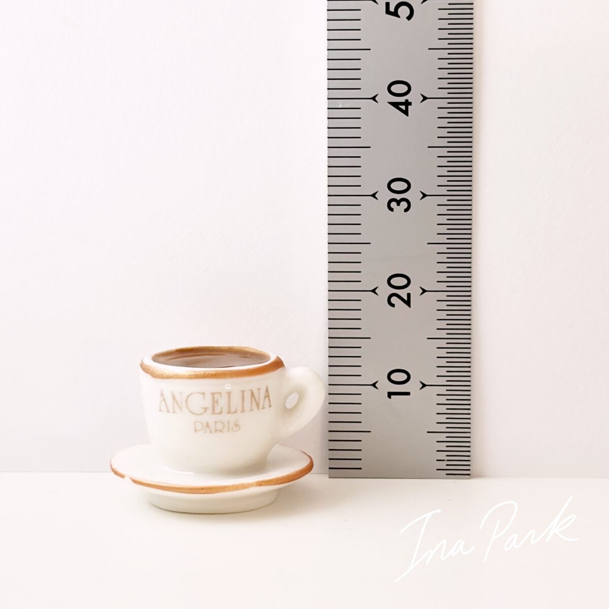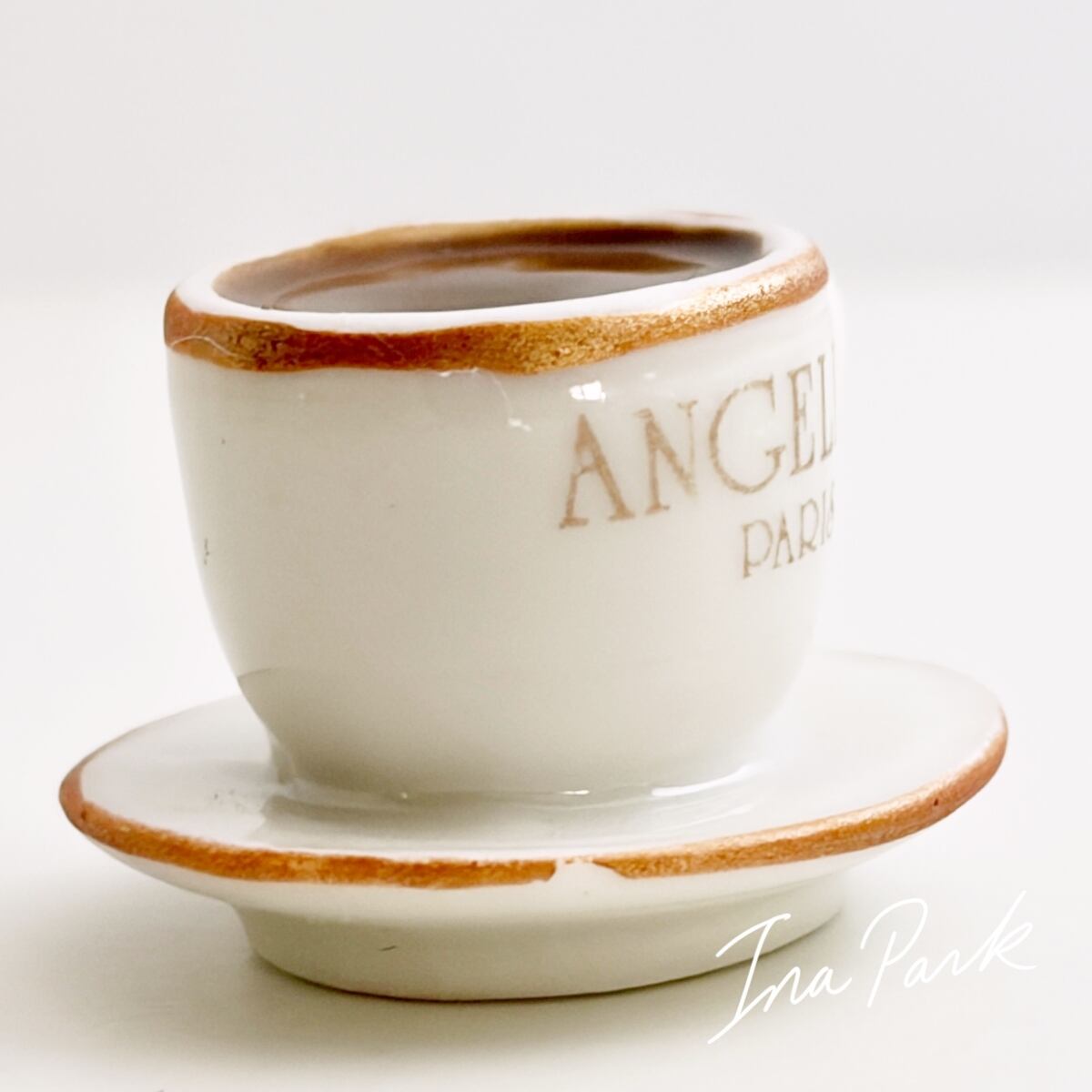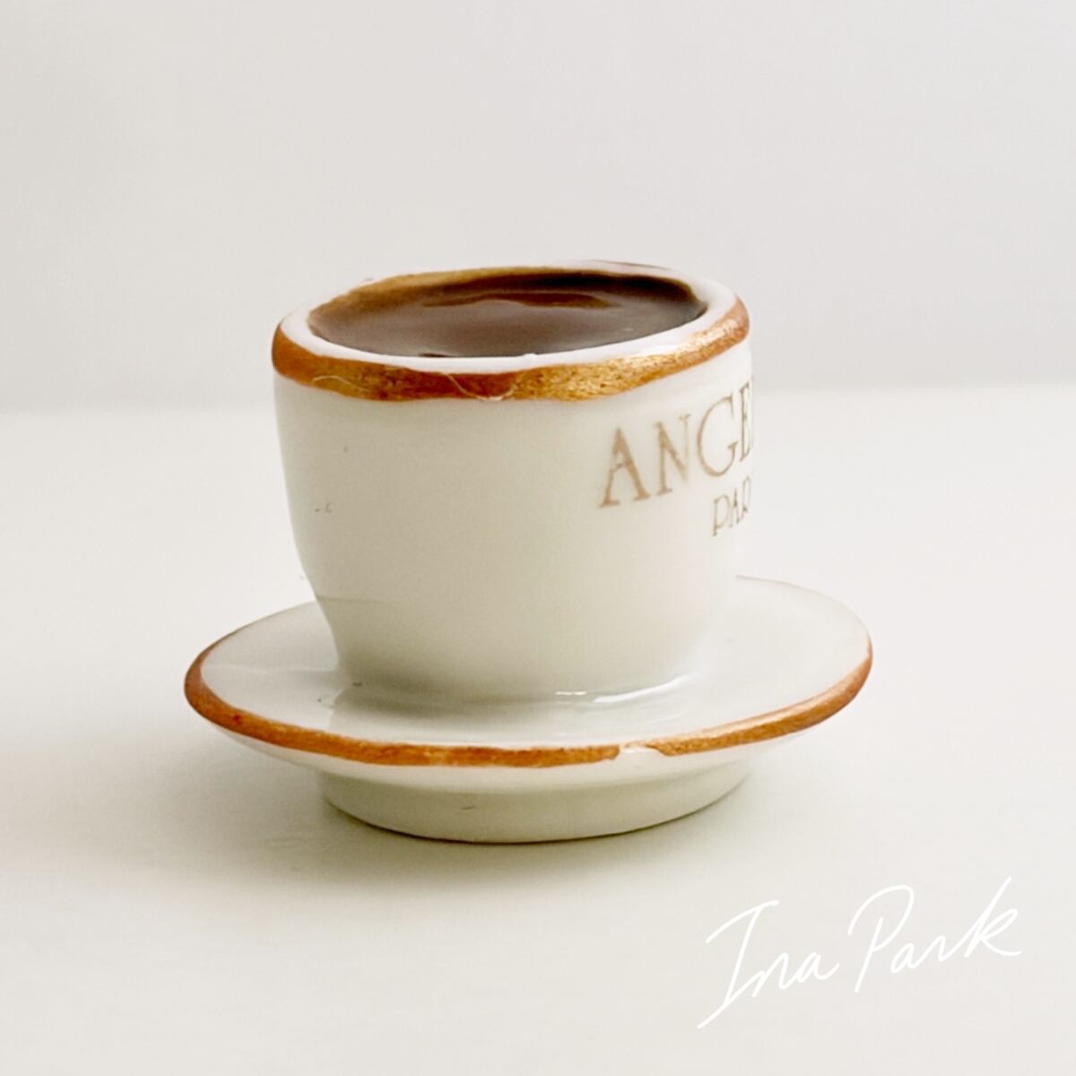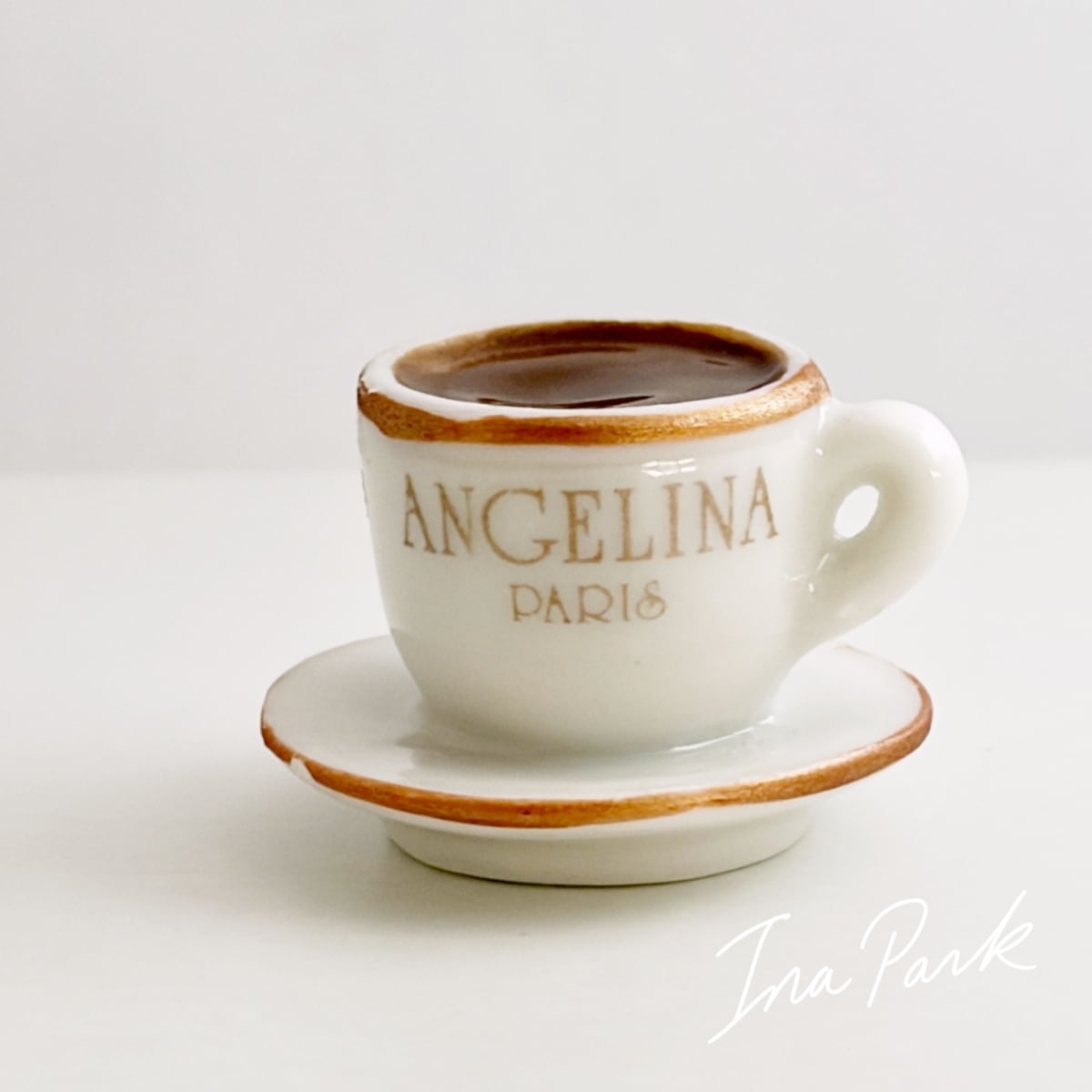 パリの老舗サロン・ド・テ「アンジェリーナ」の看板的ドリンク、濃厚ショコラ・ショー(ホットチョコレート)の入ったカップ&ソーサーのフェーブ。アンジェリーナのフェーブは年号が入っていないので厳密には分かりませんが、おそらく2016年前後のもの。