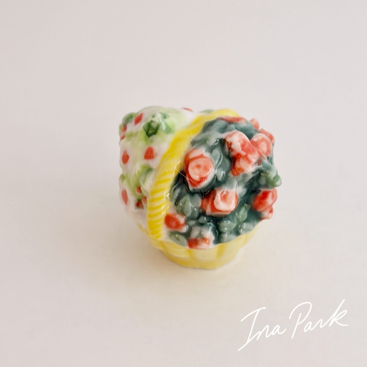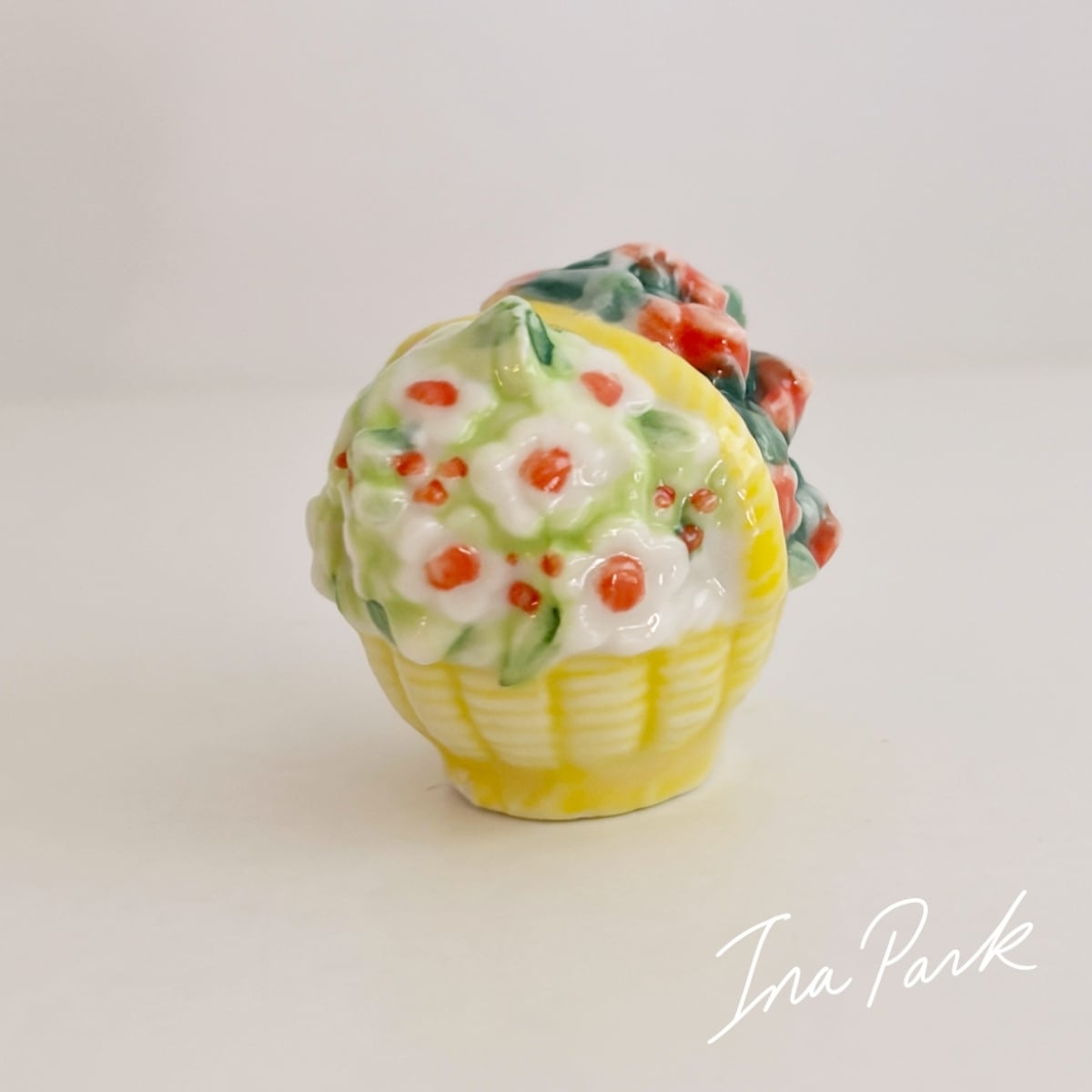 白い花と薔薇のパニエ バスケット フェーヴ フェーブ フランス製 ミニチュア 陶器 雑貨 置物