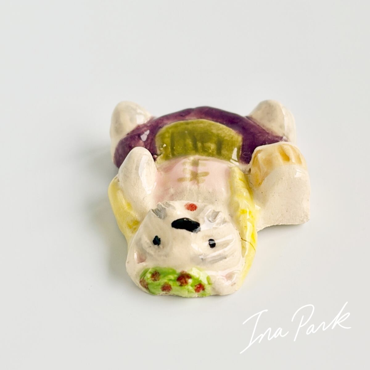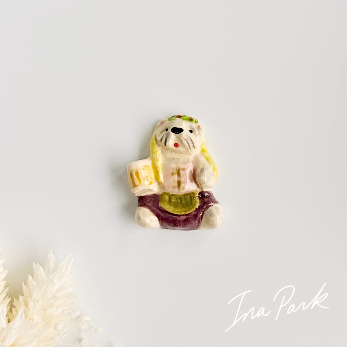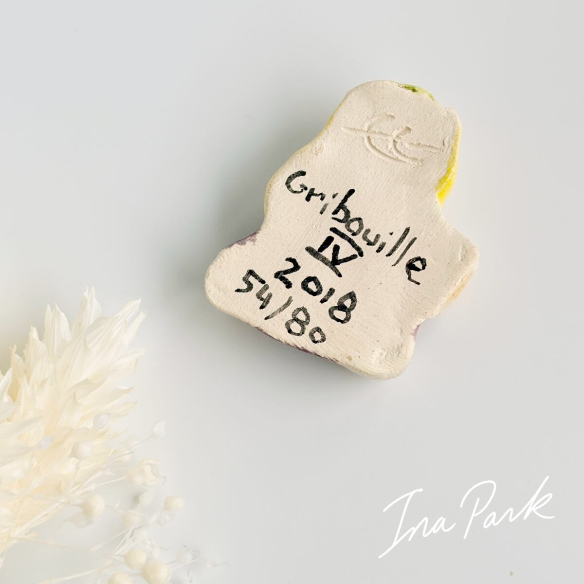 モデルになっているのはエリック氏とジル氏の愛犬グリブイユです。しばしばフェーブのモチーフとして登場しますが、このシリーズでは、アメリカ西部とバイエルン風の衣装を着て土地をエンジョイしているようです。愛らしい表情と佇まいに、大切な存在への温かい眼差しが感じられます。
